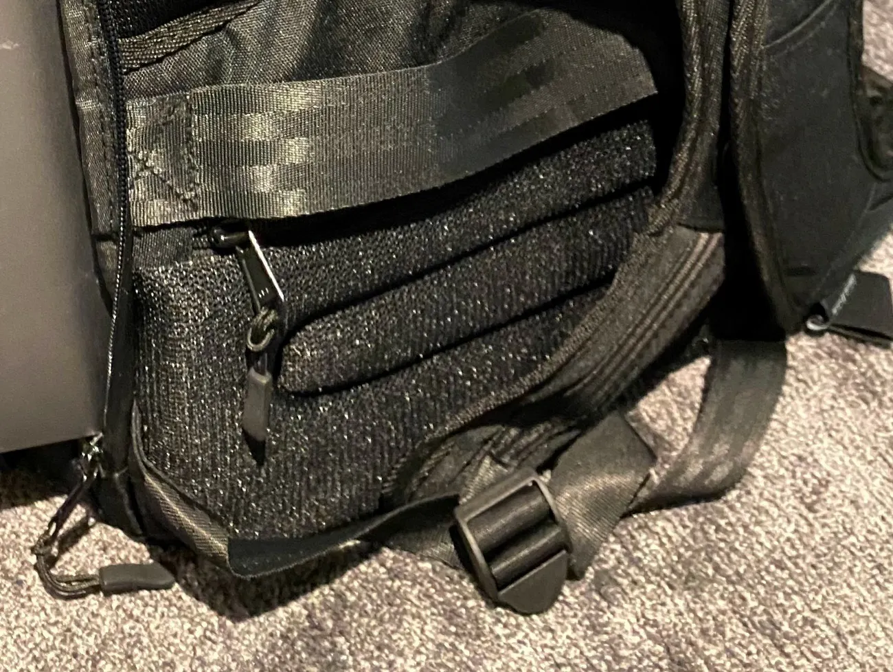 ロールトップは間口をクルクル巻くため荷物の取り出しに時間が掛かるのが難点ですが、【Vertical Ergonomic Backpack】ではロールトップを開かずとも荷物が取り出せるサイドファスナー付き。