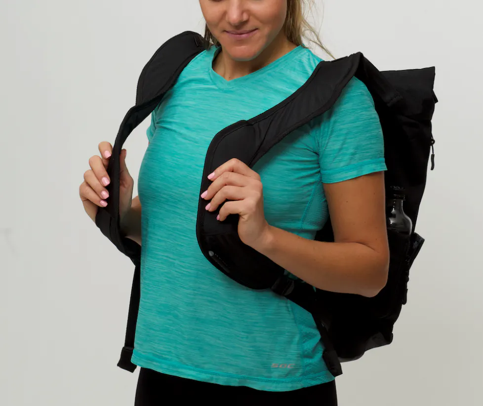 ①【Vertical Ergonomic Backpack】を背負い、ストラップの長さを調整してバックパックを体に密着させます。