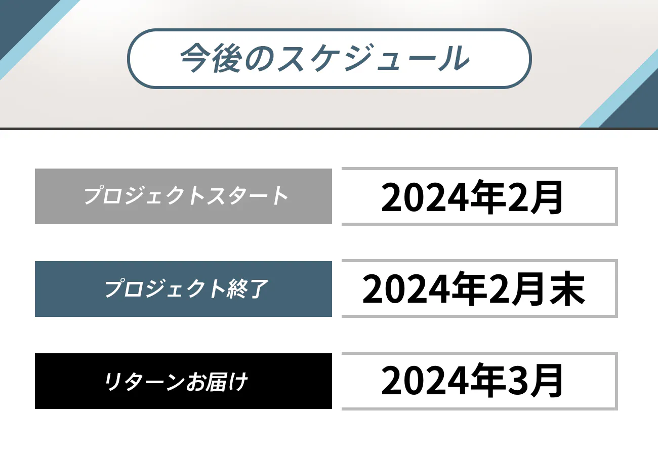 ※本文中に記載させていただいたスケジュールは、あくまでプロジェクト公開時点の予定です。配送遅延のおそれがございます。