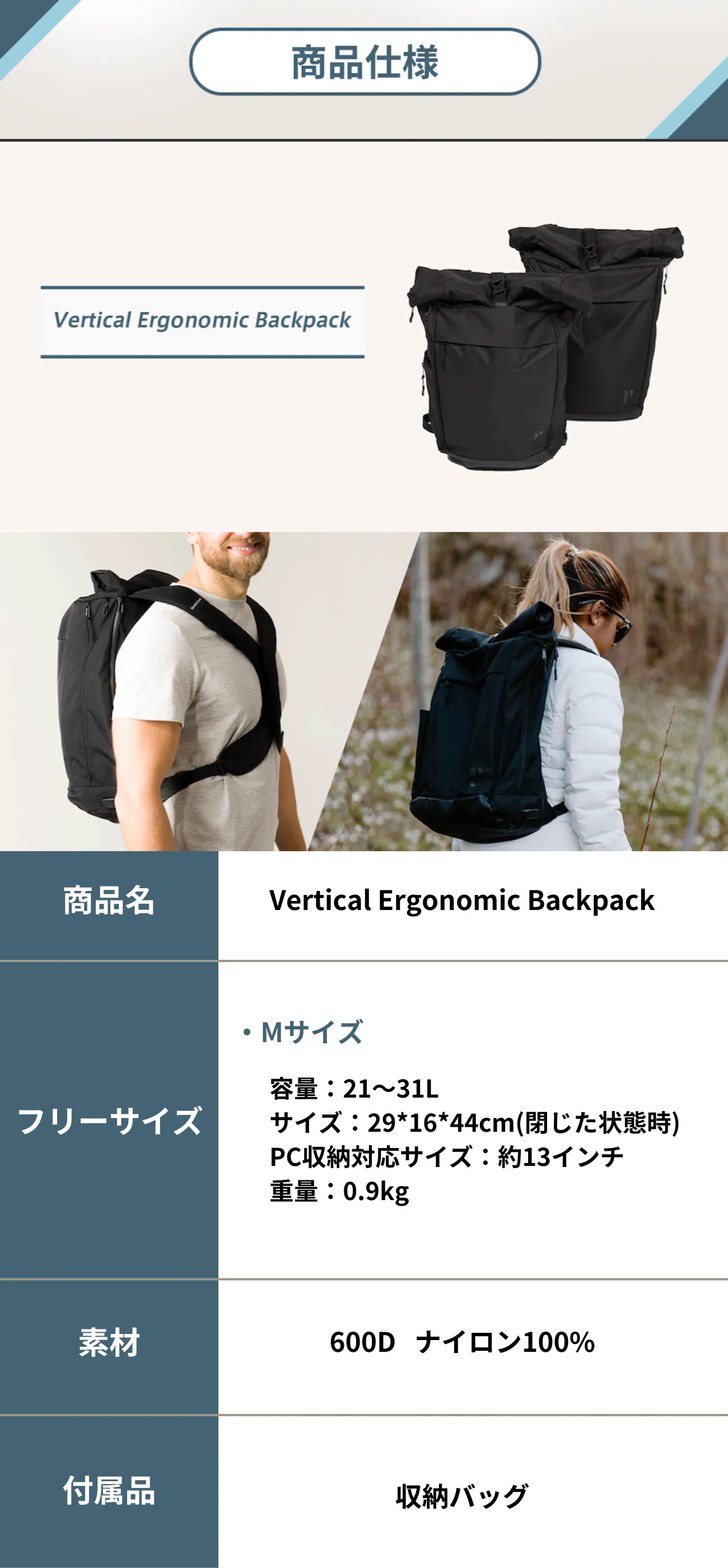 正しい姿勢に導く【Vertical Ergonomic Backpack】で移動を軽快に。
