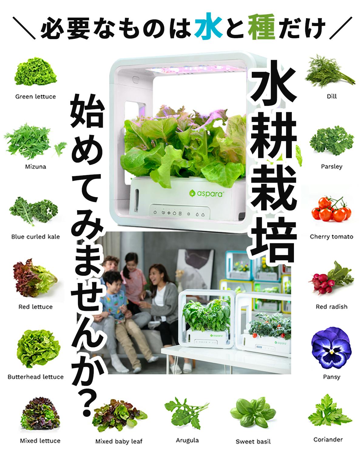「アスパラガーデンLITE」は誰でもどこでも簡単に、室内で種から野菜やハーブ、お花を育てることができる 室内用水耕栽培キットです。