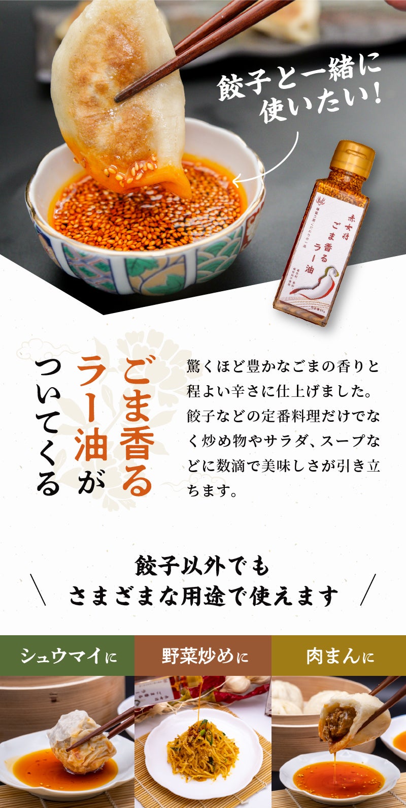 【原材料】:豚肉(国産)、小麦粉、豚骨スープ(豚背骨、豚皮、豚足、鶏ガラ)、ネギ、生姜、サラダ油、オイスターソース、醤油、ごま油、塩胡椒、砂糖