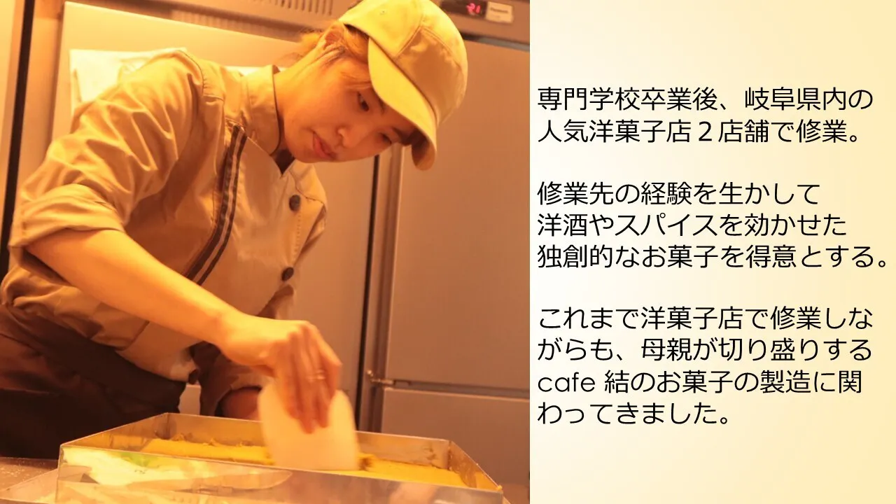 コメント:子供の頃からお菓子・パン作りが趣味の母親からの影響を受け、パティシエを志し、自分のお店を持つことを夢に勉強してきました。この垂井という素敵な場所でお店を開けることを嬉しく思います。妻とご両親と手を取り合い、皆様がゆったりと非日常を感じてもらえるそんな場所づくりを目指していきます。