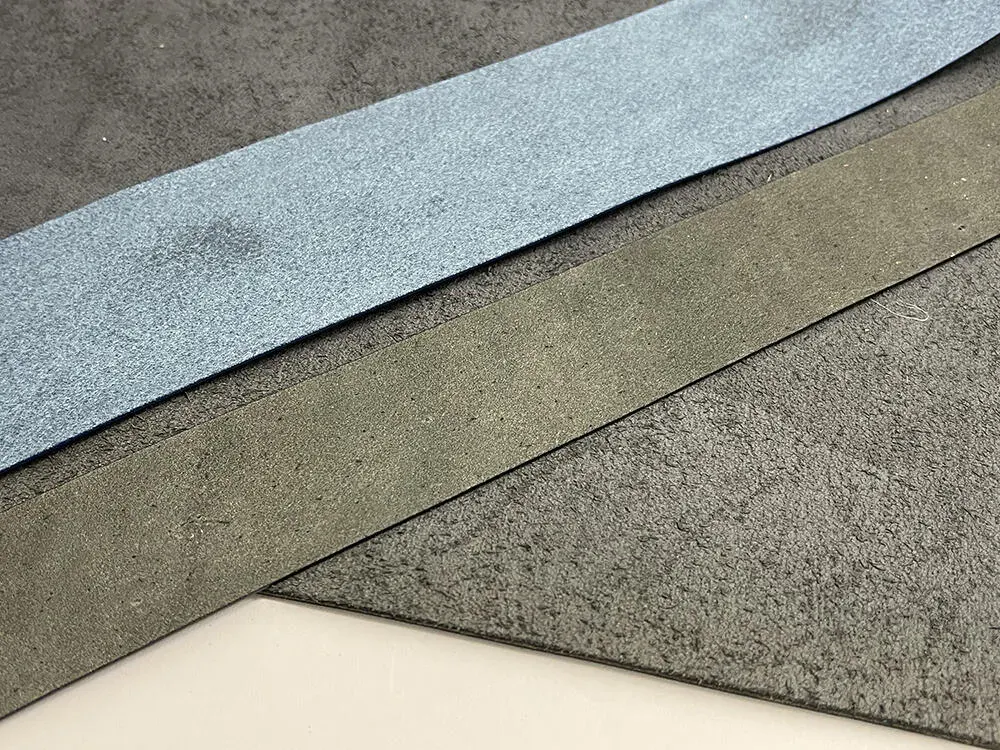 革の裏を漉くと、漉いた部分が荒れてしまいます。この問題を解決するために、「裏処理」と呼ばれるバインダー加工を施しています。