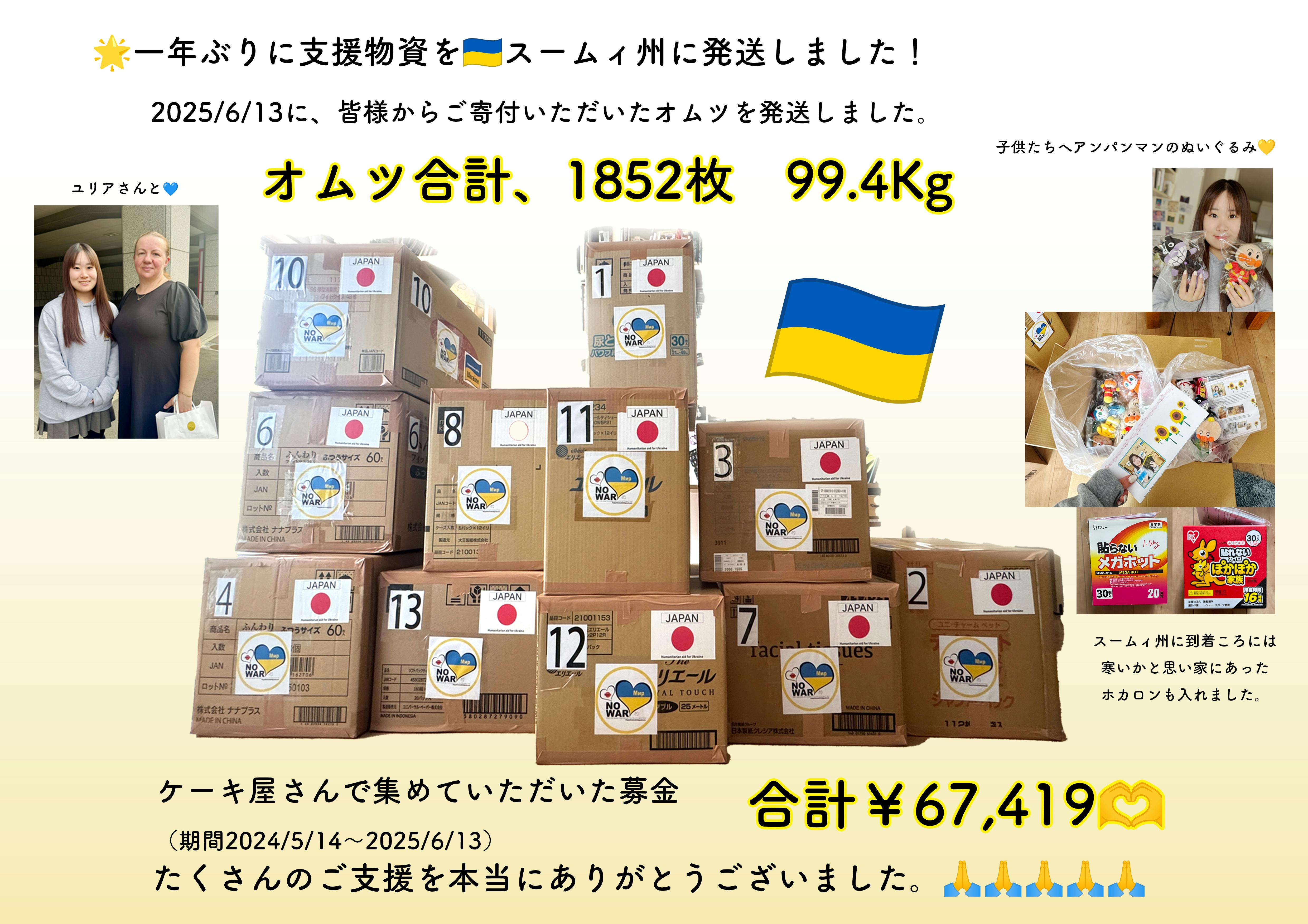 2025/06/16 20:012025/6/13に、皆様からご寄付いただいたオムツを発送しました。合計1852枚、99.4kg 13箱の段ボールを発送しました。ウクライナ大使館からご紹介いただいたユリアさんのご厚意により、皆様からお預かりした物資を、ウクライナ行きのコンテナに同乗させていただけることになりました。そのため、予定していた送料と関税がかからずに出荷することができました。杉並区の倉庫に搬入また、近所のウクライナ支援協力を頂いている、お菓子屋さんで集めていただいた募金は合計67,419円になりました。たくさんのご支援を本当にありがとうございました。Sumy州のアンナさんに、必要な物質をお聞きしたところ、「負傷者や火傷で傷ついてる人が多く、医療品が必要」との回答をいただきました。そこで、送料分と関税分として用意していた資金を医療品購入に利用し、チェストシール21枚(約10万円)と3Mの医療品約(1万円)を購入し、オムツと一緒に送りました。今回購入したフォックスチェストシール (弁付き)3M キャビロン(TM)非アルコール性皮膜 28ml 皮膚保護剤チェストシールは、昨年止血帯を購入させていただいたオーストリッチインターナショナルさんから手配しました。「チェストシールって何?」とご興味のお持ちの方は、URL動画からご覧いただくと戦争の現場で何が起きているかを少し想像いただけるかと思います。※一部、ショッキングな映像が含まれていますので、ご視聴の際はご注意ください。JP How to use Foxsealアンナさんから、下記医療品のリクエストがありましたので皆さまにも共有させていただきます。また、ユリアさんからも「医療品は非常に不足している」とのお話を伺いました。そのため、今後も引き続き資金を募り、必要な医療物資の購入を行っていきたいと考えています。2024/3/31に発送したオムツは、ポーランド在住で、ウクライナ支援家の坂本さん宛に送り、その後、坂本さんがウクライナへ再発送して下さいました。そのため、ポーランドからスームイ州までの輸送費として坂本さんにお支払いする予定の資金を保管していました。しかし、坂本さんのご厚意により、送料を坂本さんに負担していただきました。本当にありがとうございます。そのため、その資金の一部は、医療品の購入に使わせていただきました。私たちが送ったオムツを運ぶアンナさんと坂本さん終わりが見えず長引く戦争で、ウクライナの人は本当に疲れています。今後もウクライナへのご支援をどうぞよろしくお願い申し上げます。 もっと見る