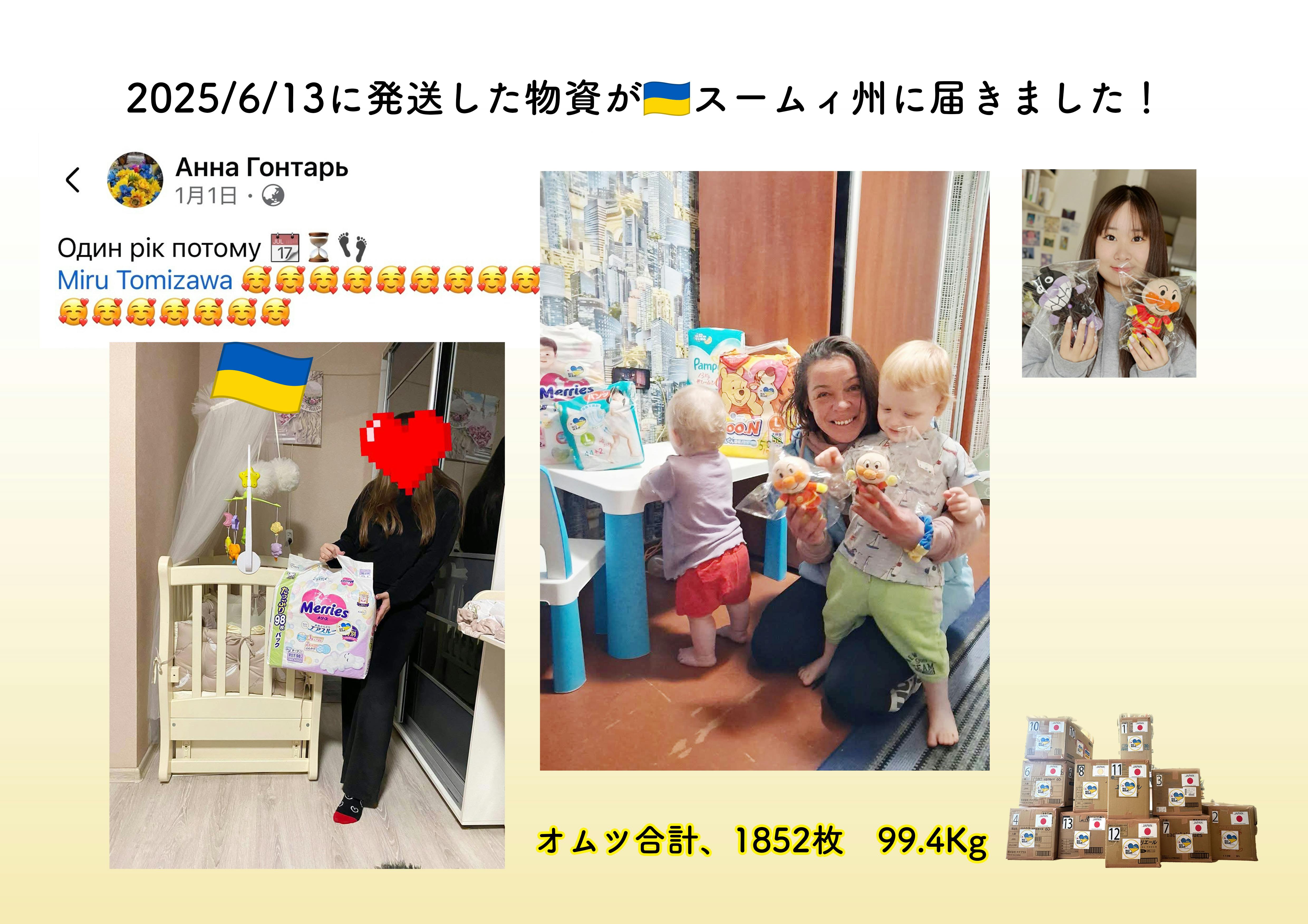 2026/01/31 12:472025年6月13日に発送した物資がスームィ州に届いたのでご報告です!いつもたくさんのご支援本当にありがとうございます。冨澤実留です。少しご報告が遅くなりましたが、ウクライナに日本からの物資が到着したのでご報告いたします。今回は、合計1852枚、99.4kg 13箱の段ボールとチェストシール21枚(約10万円)と3Mの医療品約(1万円)を購入し、スームィに送りました。※↓ウクライナのアンナさんのfacebook投稿https://www.facebook.com/share/r/15o7skHq2b/現在も多くのオムツが集まっており、募金等もいただいております。募金額13,710円また、来月には、留学していたエストニア行く予定で、ポーランドにも立ち寄ります。この支援活動にご助言を頂いている坂本龍太朗さんにお会いしてお話をうかがう予定です。何か少しでも今後の援助に繋げられるよう吸収していきたいと考えています。引き続き、ウクライナ支援は継続していこうと考えているので、何卒よろしくお願いいたします。 もっと見る