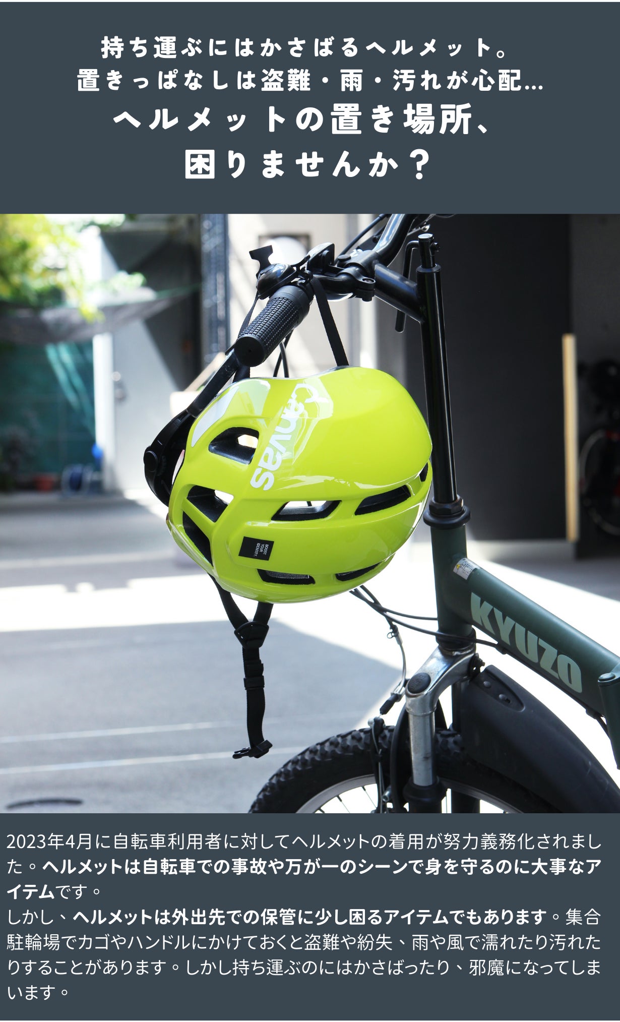 ちょっとした買い物でお店の前に自転車を止めるとき、通勤時最寄り駅の月極駐輪場に自転車を止めるとき…気がかりながらもヘルメットのストラップを自転車のハンドル部分にひっかけて置いて行っていましたが、日中雨が降ったであろう日は、ヘルメットの内部がびしょ濡れに。晴天時、運と場所が悪ければ鳥糞被害にあっていることも…。また、ヘルメットを置き去りにしている間は盗難についてもどこか気がかり。かといって持ち歩くのはとてもかさばるので、あまり現実的ではありません。