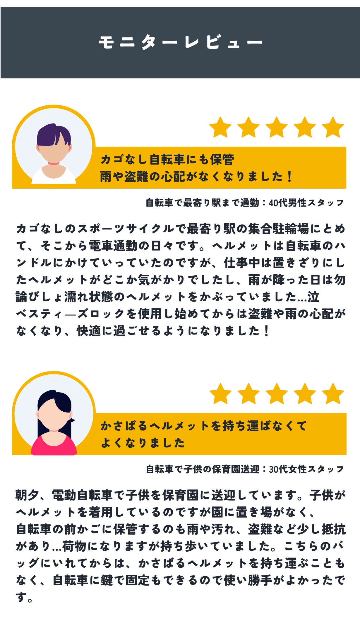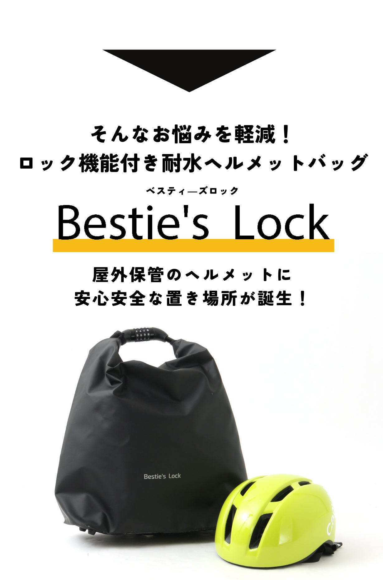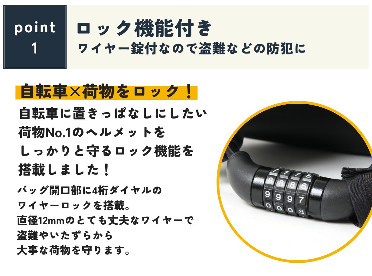 そんな思いから、耐水&ダイヤルロック機能搭載の【Bestie’s Lock(ベスティ―ズロック)】の開発に至りました。ベスティ―ズロックの登場により、従来の「自転車用ヘルメットどこに置けばいいのかな?」問題が解決し、ヘルメットの持ち運びがぐっと便利になったのではないかと思います。ヘルメットの収納に今、困っている方も、これからヘルメットをかぶる予定の方も、ベスティ―ズロックを使っていただき、皆様の自転車ライフがより豊かなものになっていったらうれしく思います!