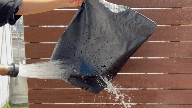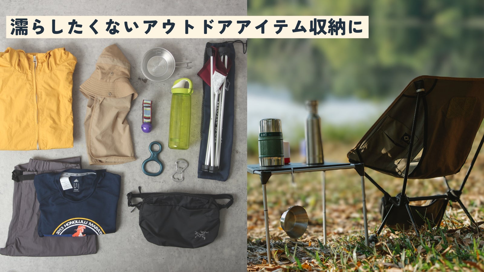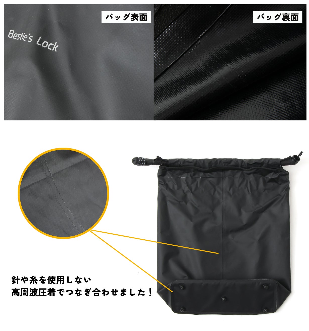 バッグ表裏にはpvcコーティングを施した耐水素材を使用。それらを圧着させることで縫い目をなくし、嵐にも耐える耐水性を実現しました!