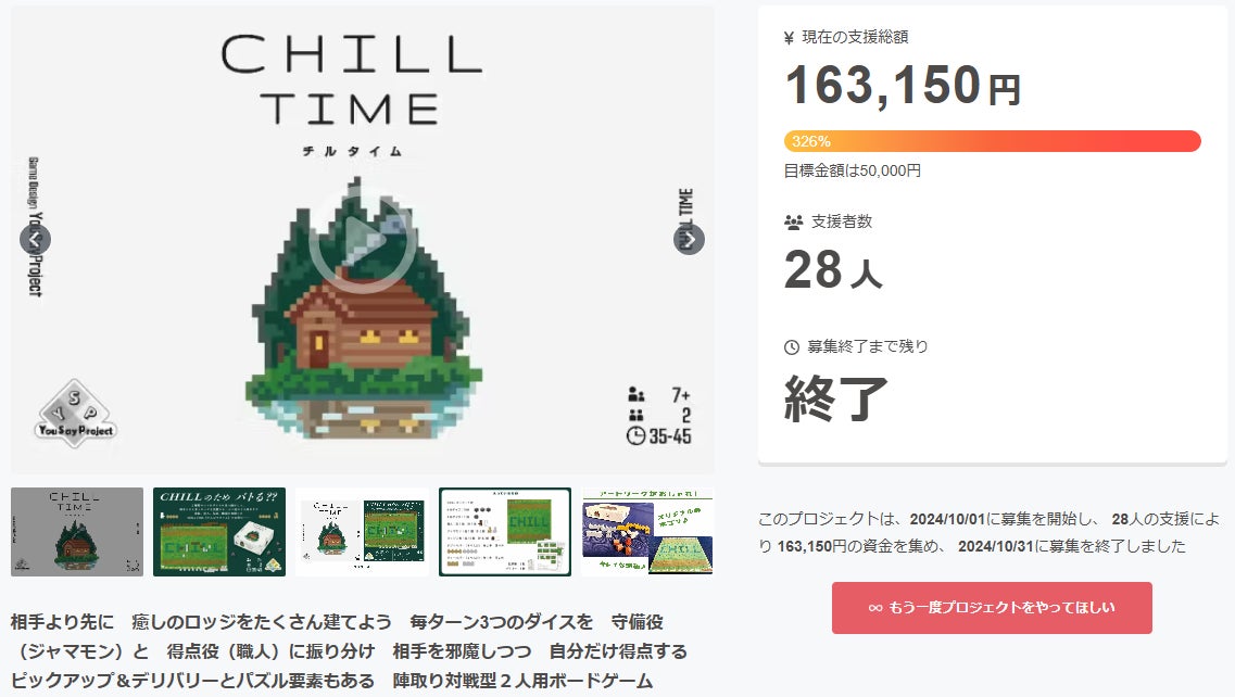2024/11/01 15:49日頃よりお世話になっております。 YouSayProjectです。 プロジェクト第二弾☆【CHILLTIME】が本日326%をもって終了いたしました。 引き続きのご支援、ならびに、拡散のご協力を賜りまして、誠に有難うございます!! <今後の活動> ゲームマーケット2024秋に【CHILLTIME】をもって出店致しますので、会場にいらっしゃいましたら是非お立ち寄り下さい。 また、この度は、中量級(35~45分)のボードゲームを販売しますので、当日の試遊がございません。 ご購入いただいた方にも、ルール説明をさせていただくチャンスが少ないので、ご要望もあり、実際に遊んでいる場面を公開することにしました。 先日のトーナメント大会の試合のプレイ動画を下記にご用意してます。参考にして頂ければと思います。 また、それとは別に、簡単なルール説明動画も、ご用意がございます。【トーナメント大会】第一回戦 https://x.gd/VQwuD【CHILLTIME】遊び方簡易説明動画 https://x.gd/qRwJ6 Xなどにて、ゲームマーケットに向けての宣伝などをツイートすると思いますので、引き続き拡散など、ご支援を頂けましたら嬉しいです。 今後とも、宜しくお願い申し上げます。 もっと見る
