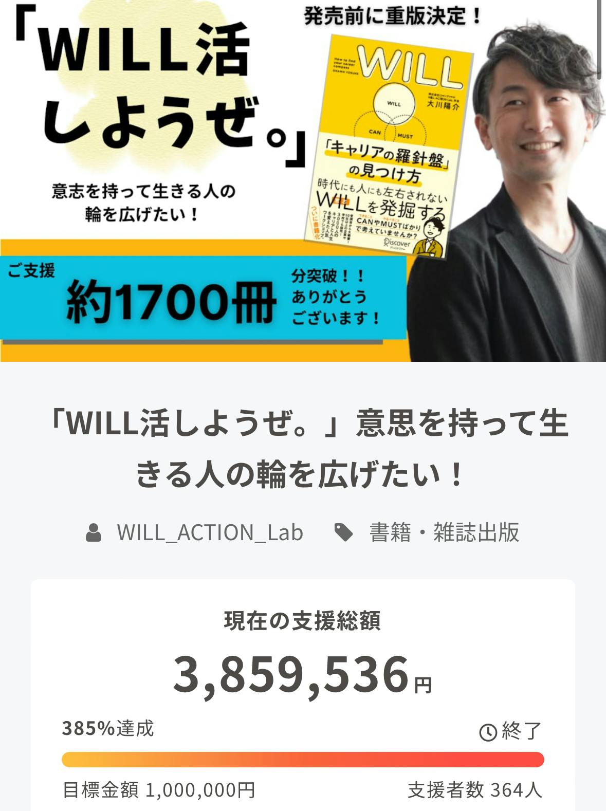2024/03/27 12:43こんにちは。株式会社ローンディール WILL-ACTION Lab.の大川です。3/25(月)23:59に、はじめてのクラウドファンディングが終了しました。翌日は、フッと力が抜けて真っ白な灰になっておりましたが、ご支援いただいた内容を集計/整理しながら、この喜びを噛み締めております。最終的には、目標の100万円を大きく上回りました。一件でも入るかどうかずっとスマホを見守っていた2/17から、少しずつ大きな応援の声が届くようになり、胸の鼓動の高鳴りを感じながら、この1ヶ月強を過ごしてまいりました。支援いただいた額は、【3,859,536円】(達成率約386%)支援していただいた人数は、【364人】未来のWILLを育てるために寄贈できる冊数は【800冊近く】になります!単純計算でも1人10000円以上の支援額になります。細かい集計をいま行っておりますので、詳しくは追ってご報告いたしますが、現時点で見えている数字だけでも、開始前には想定もしなかった反響でした。これらの想いを受けて、「WILL活」をひろげていくのが本番です!!!今回ご支援いただいた皆様と一緒に進めていけるのが一番うれしいので、ぜひ「こんなアイデアあるよ!」「うちでもちょっと講演してよ!」など、お気軽にお声がけいただけますと幸いです!各リターンのお届け日など、詳細は明日明後日中に連絡いたしますので、少々お待ちいただけますと幸いです。まずはこの場を借りて、大きな感謝をお伝えさせていただきました!引き続き、応援・協働よろしくお願いいたします!!!!大川 もっと見る【残り12時間!】最後の拡散にご協力いただけますと嬉しいです!