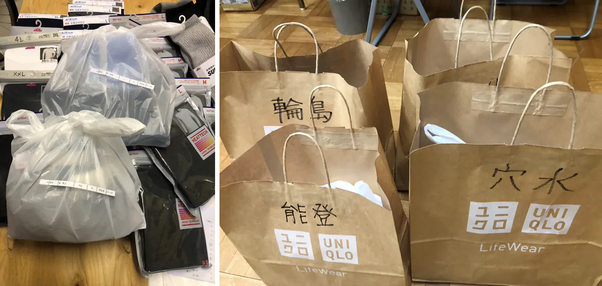 このクラウドファンディングを準備している間に、代表砂山が高知県林業大学校でお話しする機会があり、ご厚意で募金箱の設置をしていただきました。現地での断水により洗濯や乾燥などができないため、衛生の観点から緊急性が高いと判断し、その募金から下着や靴下を購入して、避難所から現場に出動している20名の方に届けました。