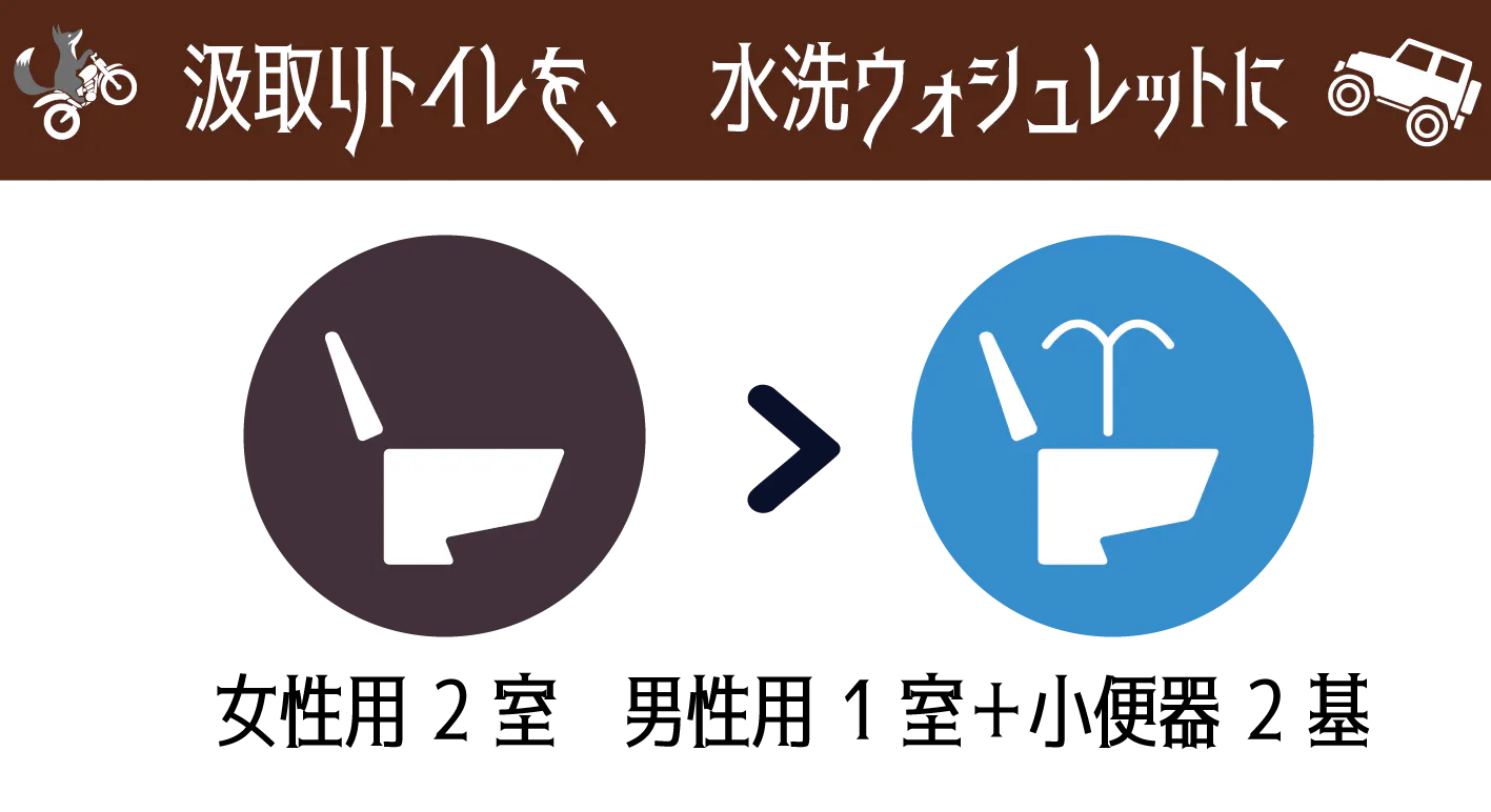 今回のプロジェクトではOff-Road Land Mioの水回りを一新し、トイレは水洗に、炊事場の水は飲み水にしてキャンプ場をご利用のお客様がより快適に過ごしていただけるための資金を募ります。