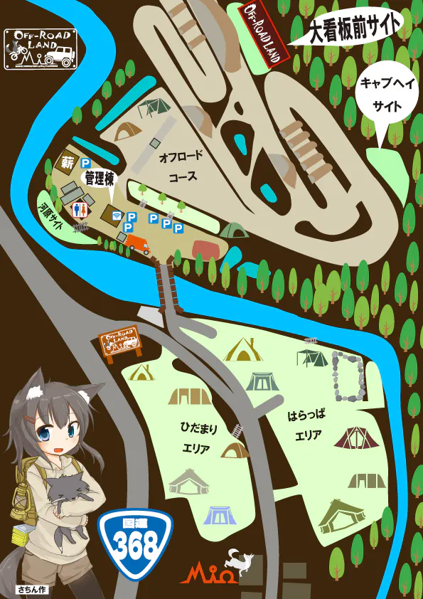 オフロードランドMioはオフロードコースと2つのキャンプエリアからなります。全面フリーサイトで、テントを張る場所は早い者勝ちです。はらっぱエリアの川沿いでは、清流の流れを眺めながら自然を満喫できます。ひだまりエリアははらっぱエリアを高い位置から見渡せる開けた視界が解放感を得られます。