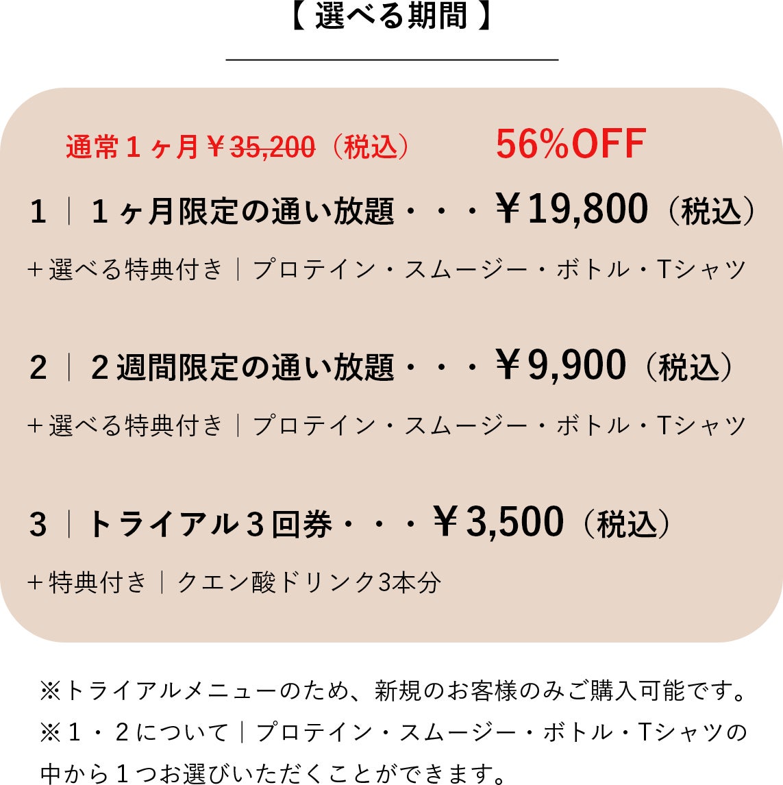 「01トライアルメニュー」をご購入いただいた方は、店頭にてお好きな商品1点をお選びいただけます。
