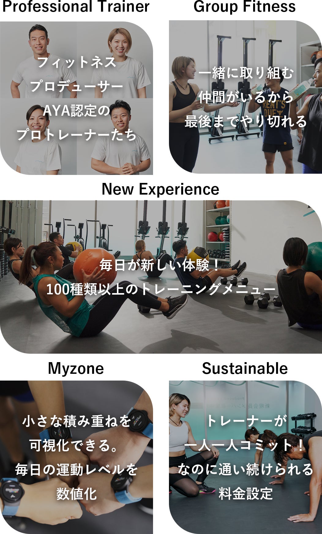 その結果、本当に自分にあっているジムが見つからず、ダイエットに成功してもまたリバウンドしてしまうという人をたくさん見てきました。私達は、本気で理想のカラダを叶えたい、そして、その手に入れたカラダであり続けたいと思っている人たちのために、たとえハードな時があっても通い続けたくなる環境と継続して効果が得られるプログラムを追求し、”持続可能な”フィットネスプロジェクトを昨年スタートしました。