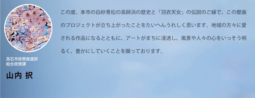 南海電気鉄道の高師浜線リニューアル運行に合わせて、2箇所で壁画を描きます。古くは沿岸部の美しさから景勝地として栄え、三大名松のひとつに“羽衣の松”がありました。