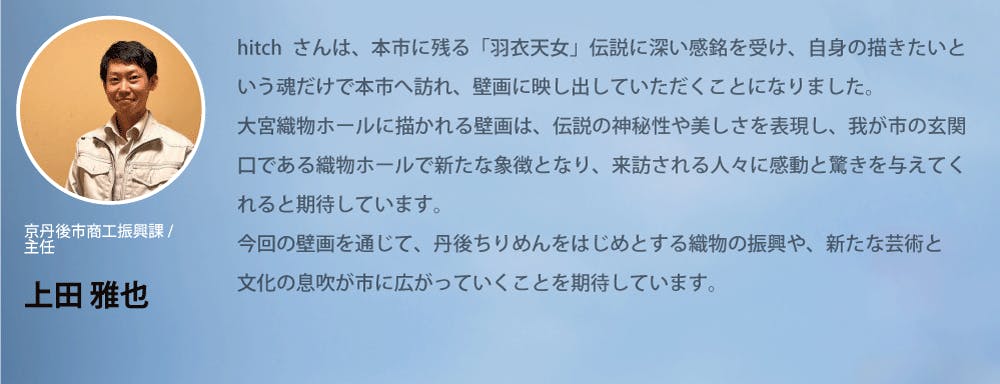 「同じ昔話が残る各地に壁画を描きたい。」新たなアプローチで壁画カルチャーを盛り上げたいと思っています。壁画は新たな時代の大衆芸術だと信じています。街(の人々)から集めた資金をアートに変えて街(コミュニティ)に還す。大好きな壁画を描くことが、そこに住む方々の地域への愛着に繋げられたら本望です。