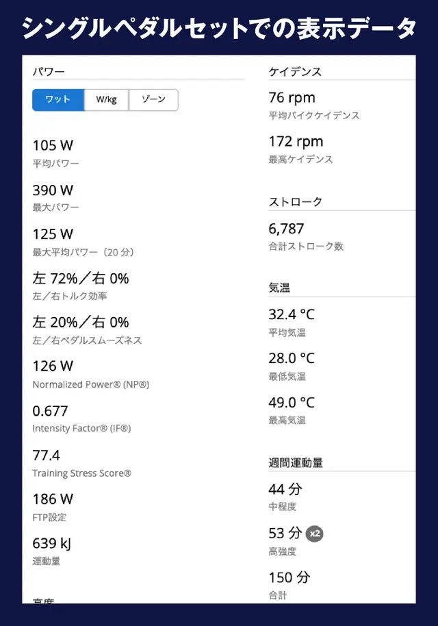そのため右足なら右足、左足なら左足のパワーを別々に測定できます。