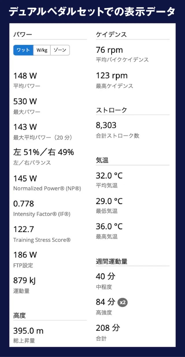 さらにデュアルペダルセットでは左右のペダルのセンサーで比較したパワーバランスの測定まで可能です。