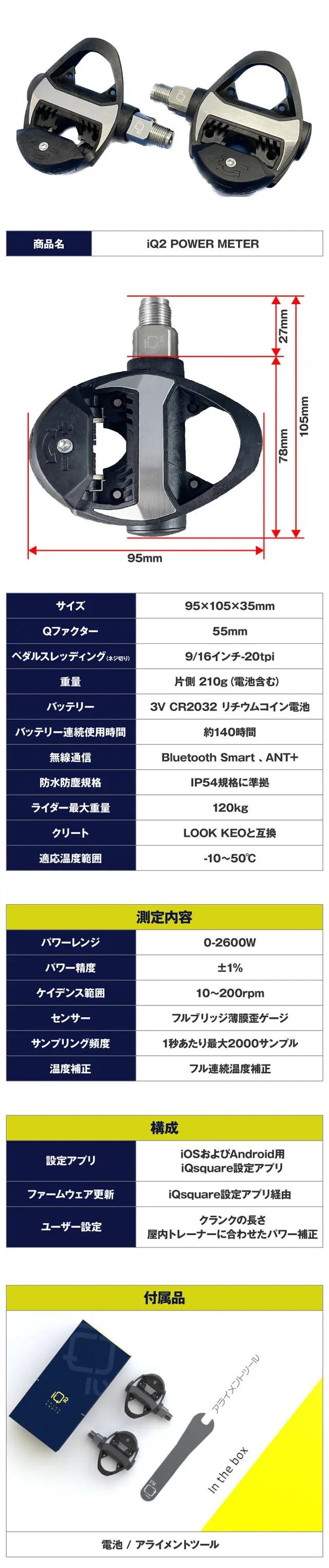 iQ2 POWER METERは幅広い競技用バイクやサイコン(サイクリングコンピューター)と互換性がある、ロードバイク用のペダル型パワーメーターです。