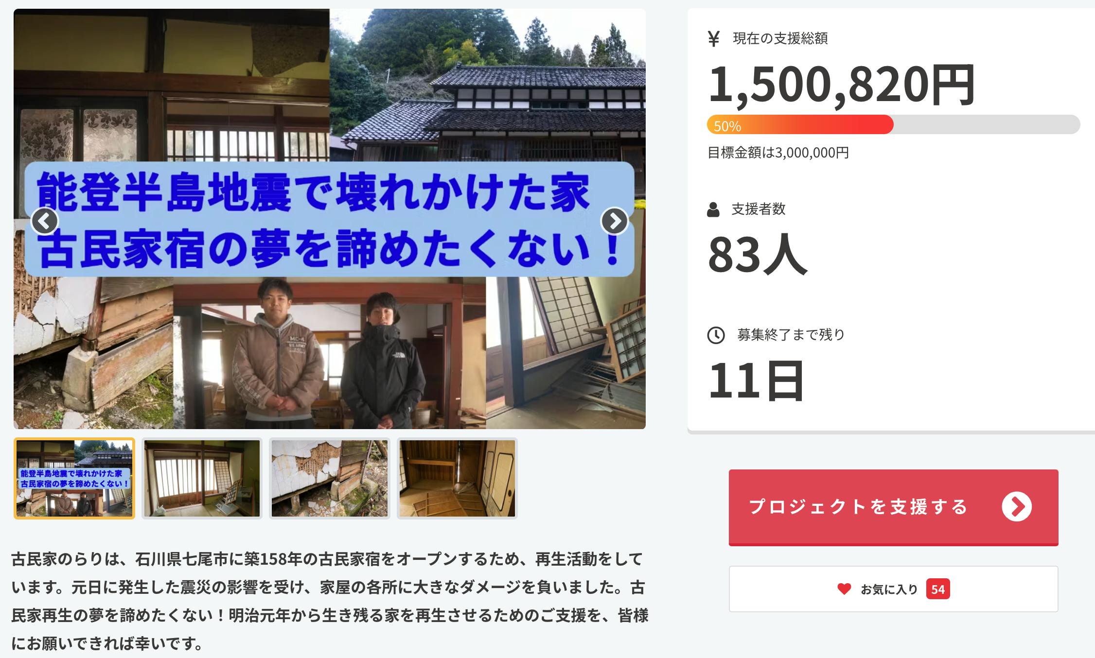震災後に家を見た時、明治元年に建ったこの家が、令和の予測不能な震災にも耐えた事実に驚いたと同時に、暗いニュースで溢れてる今の状況の中、この家を能登半島の魅力の一つにできるよう、”古民家宿を必ず復旧し、完成させたい”という思いでいっぱいになりました。