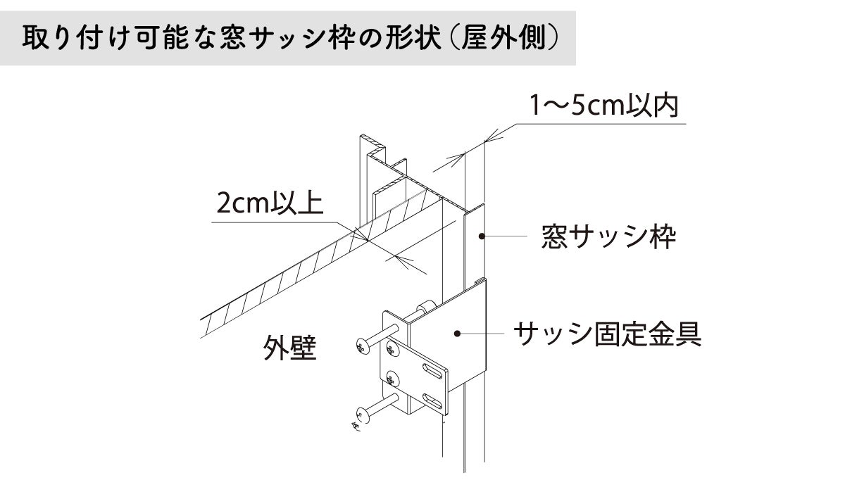 窓サッシ枠の形状は、外壁から2cm以上張り出し、折曲がったところの寸法が1~5cm以内のサッシ枠に取付け可能です。