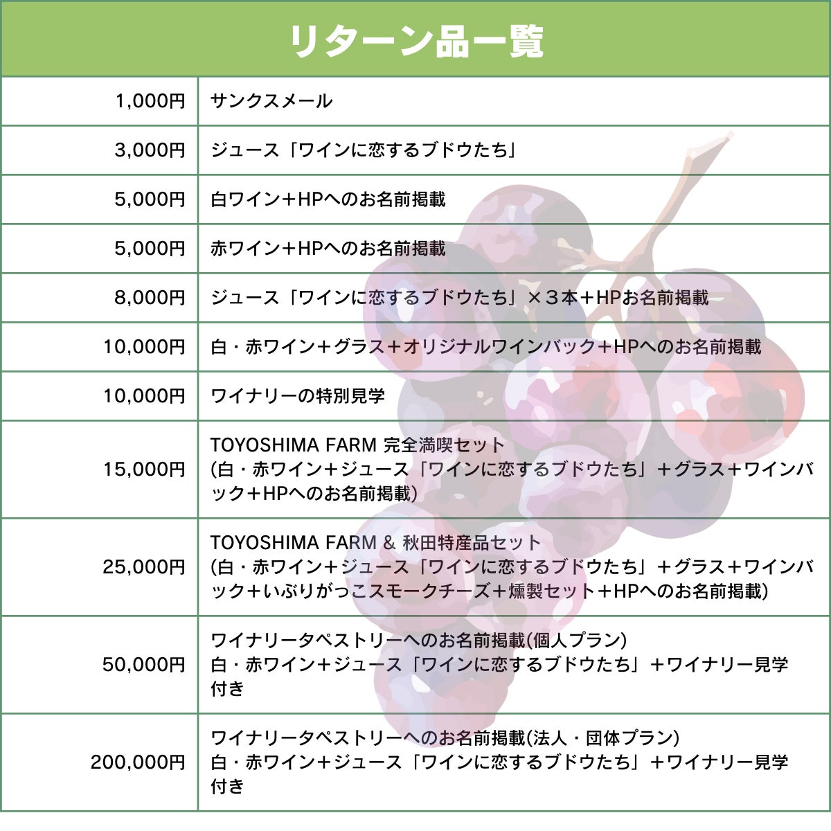 様々なリターンをご用意させていただきました。開業を目指しているワイナリーで醸造したワインをお届けすることはまだ叶いませんが、限定品のオリジナルバッグや秋田ならではのワインと相性抜群のおつまみセット、開業直後のワイナリーを見学できるプランなど、バリエーション豊富に揃えましたので、ぜひお気に入りのリターンを探してみてください!