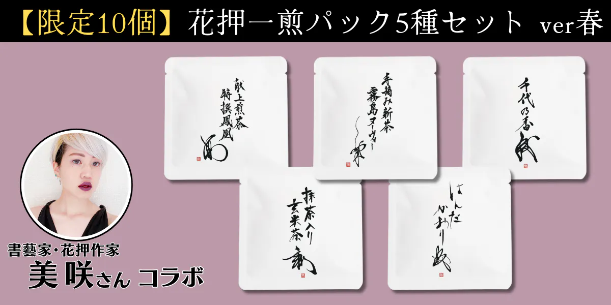 「手摘み新茶 霧島ヌーヴォー」が入る〈春〉verと「夏季限定茶 こみなみ」が入る〈夏〉verをそれぞれ限定10個にてご用意しております。書と日本茶の特別なコラボレーション「花押一煎パック」、ぜひこの機会にゲットしてください!