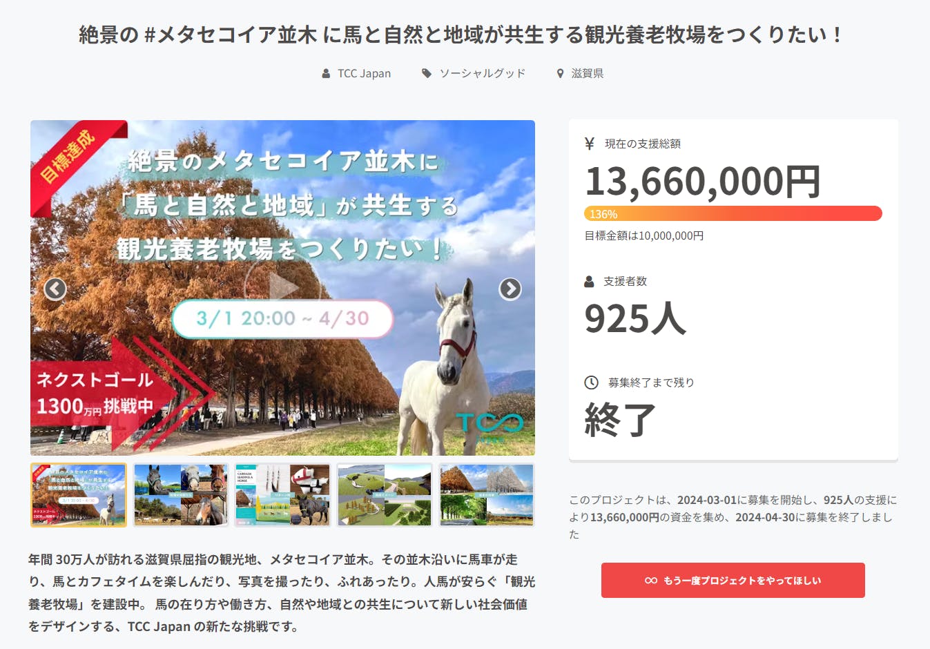 2024/05/01 13:04皆さま、こんにちは。昨日をもちまして、約 2か月間 挑戦してきました「TCC メタセコイアと馬の森」クラウドファンディングを無事に終えることができました!まずは応援ご支援いただいた皆さまに、心より御礼申し上げます。ありがとうございました。なんと終了まで約 2時間を残して ネクストゴール 1300万円を達成し、それから日付が変わるまでさらにたくさんのご支援が届き続けました。皆さまからのご支援はもちろん、応援メッセージやコメント、SNS での発信など、本当に勇気をいただきました。----------------------------------------------▼クラウドファンディング 最終結果https://camp-fire.jp/projects/view/736495【ご支援金額】13,660,000円【ご支援者数】925名※この他にも「TCC みらい基金」へのご寄付を多数いただきました----------------------------------------------ご支援時にお申込みいただいたリターン内容は、これから順次ご対応させていただきます。改めて、各リターンごとにご案内をお送りさせていただきますので、どうぞ今しばらくお待ちください。またモザイクアートに使用する写真データのご送付には、まだお時間があります。皆さまの素敵な 1枚をぜひお寄せください。----------------------------------------------▼モザイクアート 参加方法はこちらhttps://camp-fire.jp/projects/736495/activities/566673#main【写真送付期限】5月12日(日) まで----------------------------------------------昨日のライブ配信でもお話ししましたが、この「TCC メタセコイアと馬の森」はここからがスタートです。ようやくプレ営業を開始できたものの、皆さまの憩いと安らぎの場となるメイン建築や全体竣工にはまだ時間が掛かります。皆さまおひとりおひとりの想いを受け止め、この「TCC メタセコイアと馬の森」をしっかりと根付かせていくため、これからますます頑張ってまいります。引き続き、あたたかく見守っていただけますと幸いです。そしてもちろん、「TCC メタセコイアと馬の森」へのご来場をお待ちしております♪Instagram > https://www.instagram.com/tcc_metasequoia_horse_forest/これからも 1頭でも多くの馬たちのために、様々な形で活動を続けてまいります。引き続き、ご支援ご協力をよろしくお願いいたします。TCC Japan - 馬と共に社会をゆたかに - もっと見る