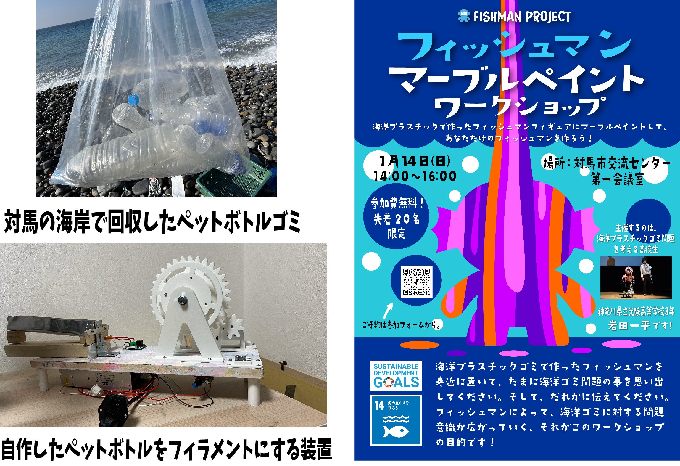 実際に一度、ペットボトルから3Dプリンターのフィラメントを制作し、1月14日に対馬市交流センターにて、フィッシュマンのアートワークショップを開催しました。