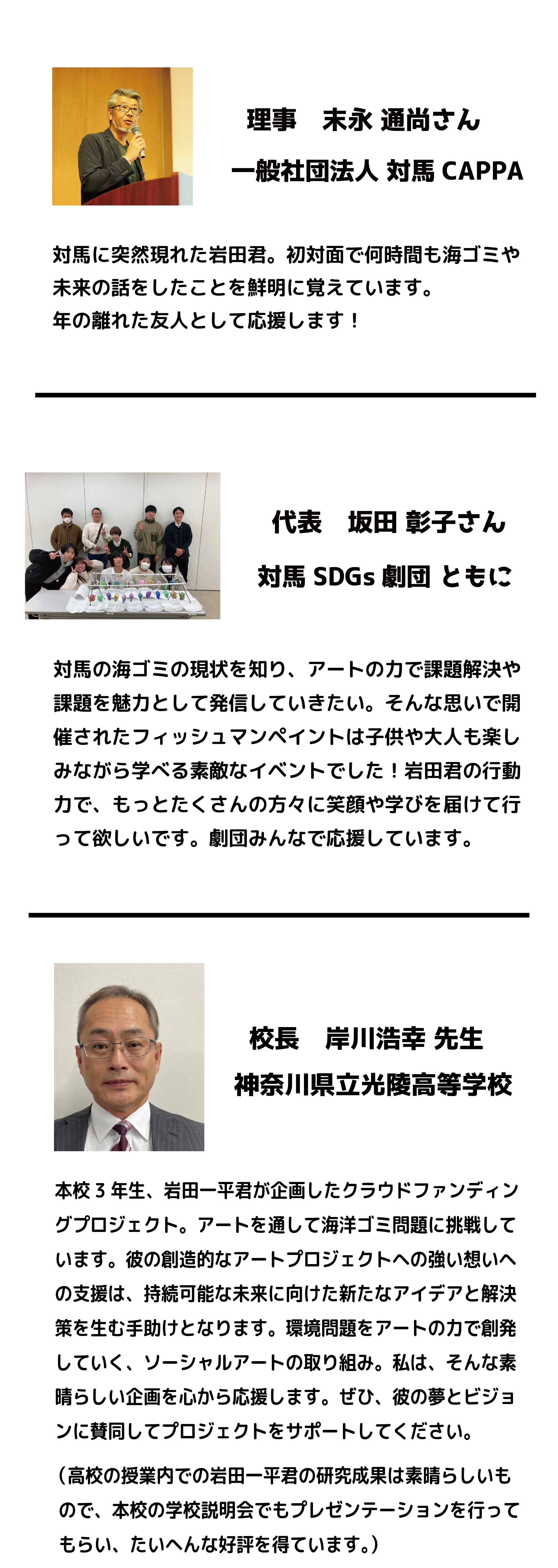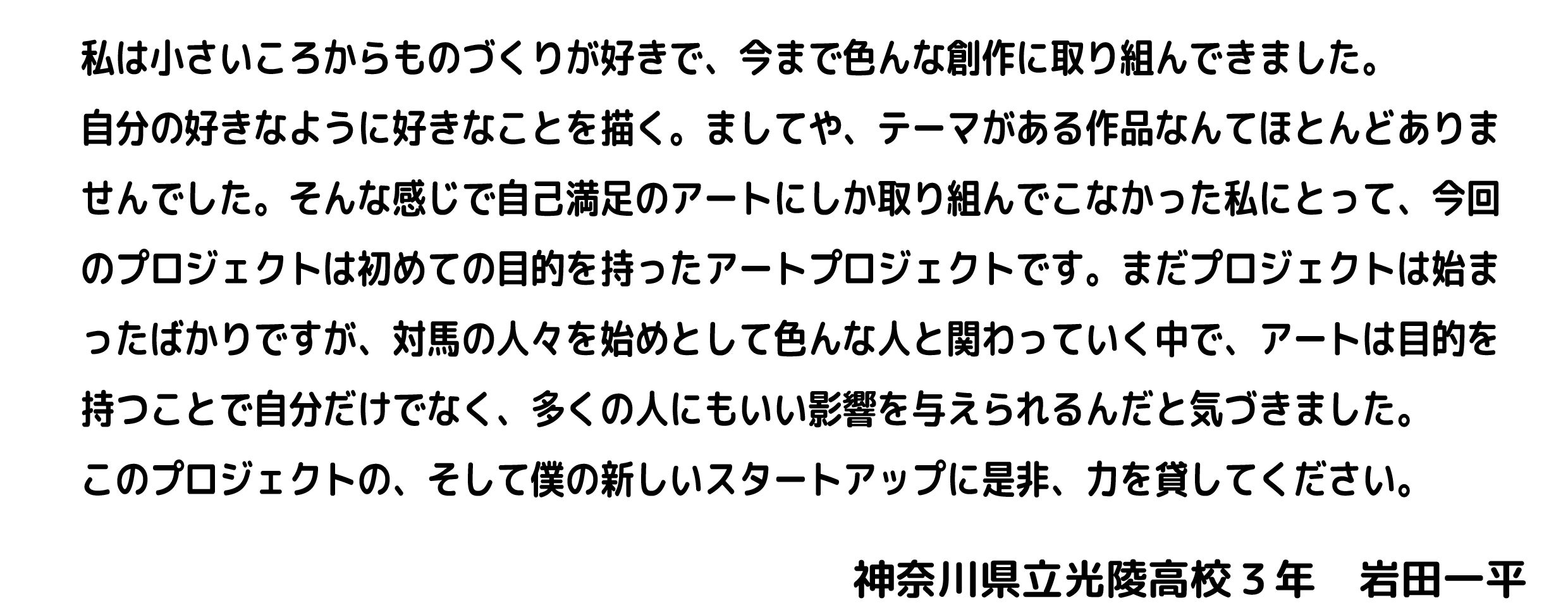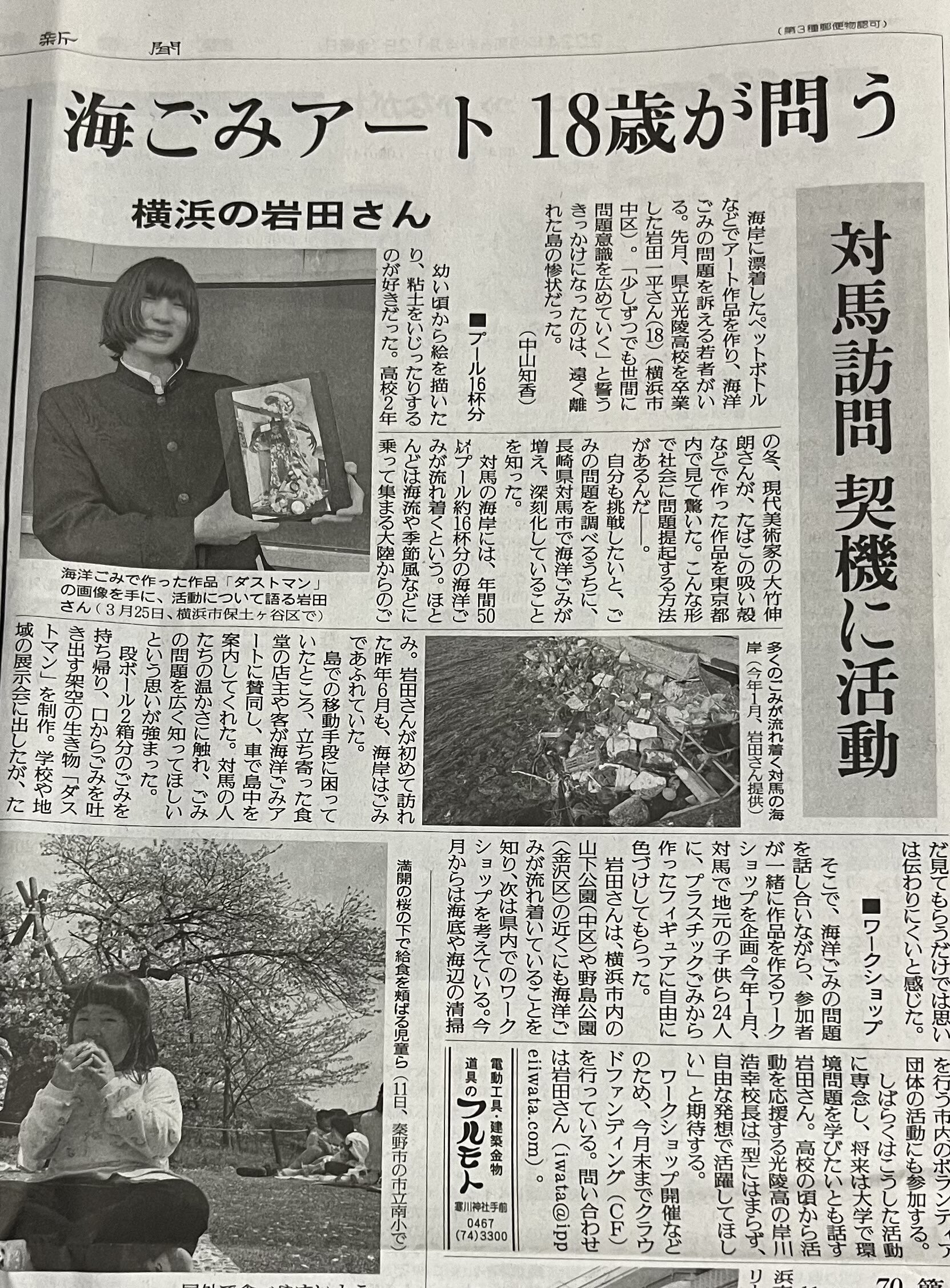 初めまして!神奈川県立光陵高校3年の岩田一平です。私は高校三年生の6月に海洋ゴミ問題を抱える地域である対馬に出会ったことをきっかけに、現在は環境問題の意識を広げるためのアート活動をしています。