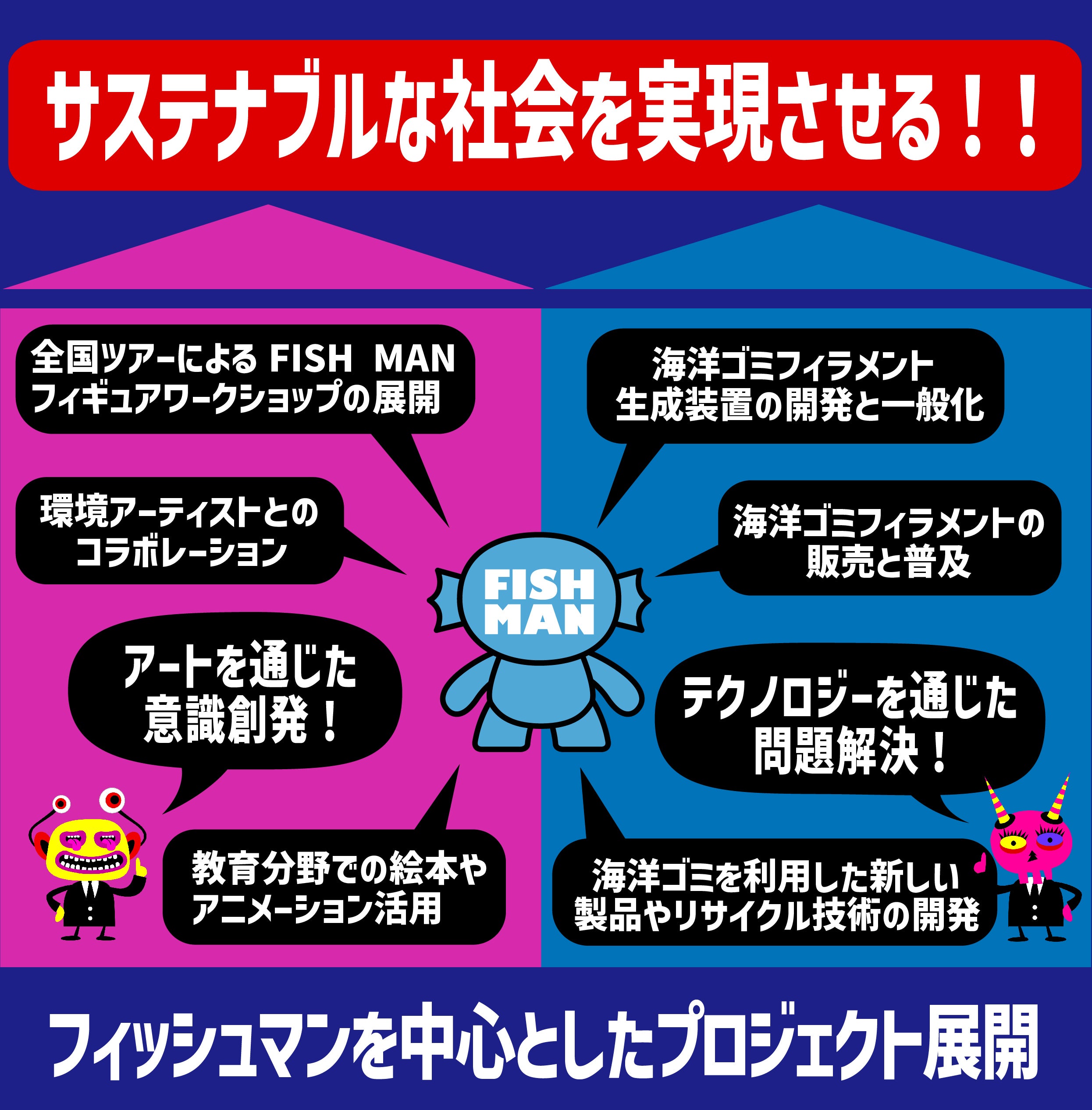 このプロジェクトは海洋プラスチックから作ったフィギュアをワークショップなどを通して、皆にペイントしてもらい、そのフィッシュマンのアートフィギュアを身近に置いてもらうことで、たまに海洋ゴミ問題の事を思い出してもらう。そして、誰かに伝えていってもらう。フィッシュマンによって海洋ゴミに対する問題意識が広がっていく、そんなプロジェクトです。