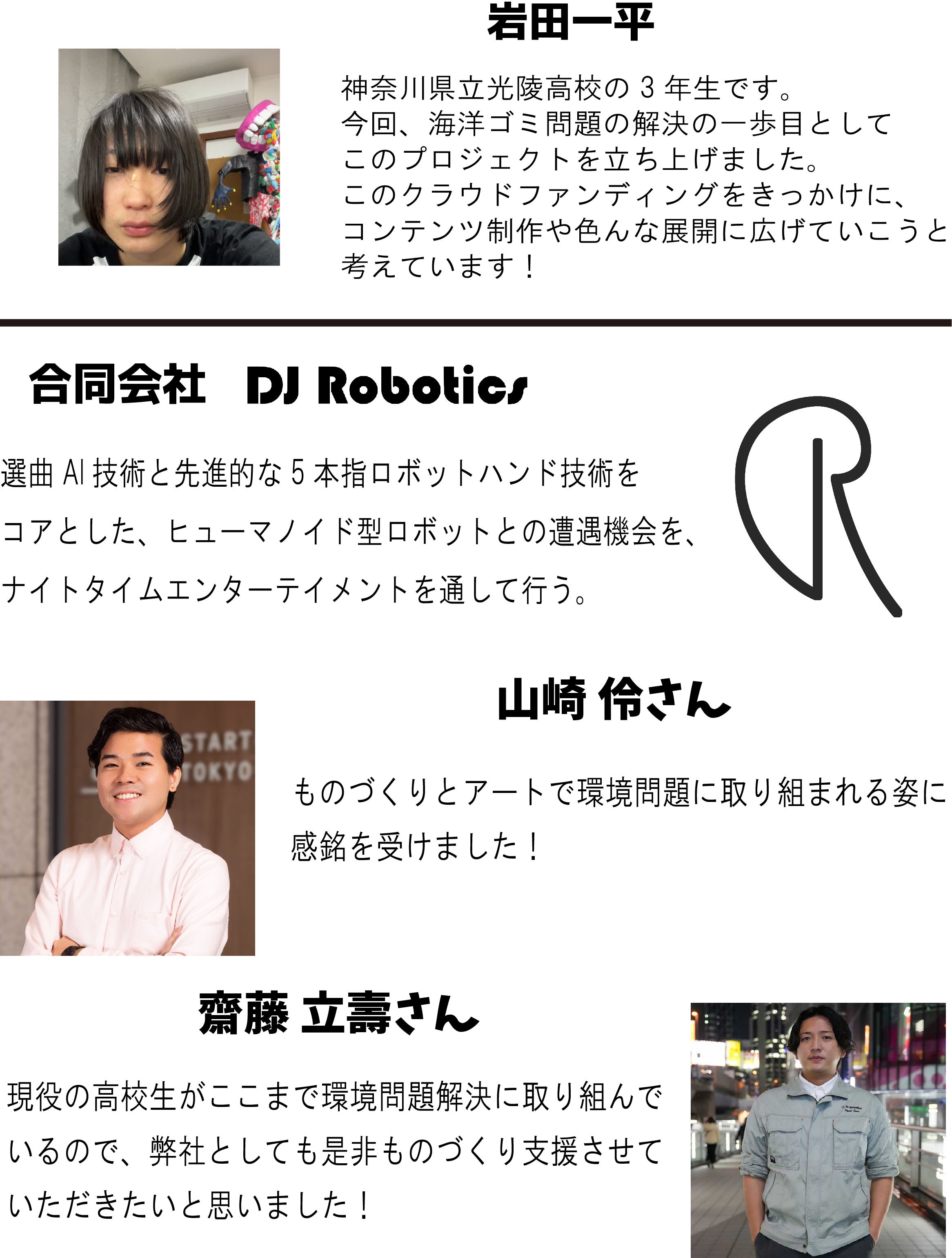 そして今回このアートフィギュアを海洋ゴミで制作するために、装置の開発資金が必要です。私はこのプロジェクトを成功させ、海洋ゴミ問題の意識を広げていくと共に、環境問題に興味のあるアーティストとのコラボレーションなど、さらなる展開を実現していきます!