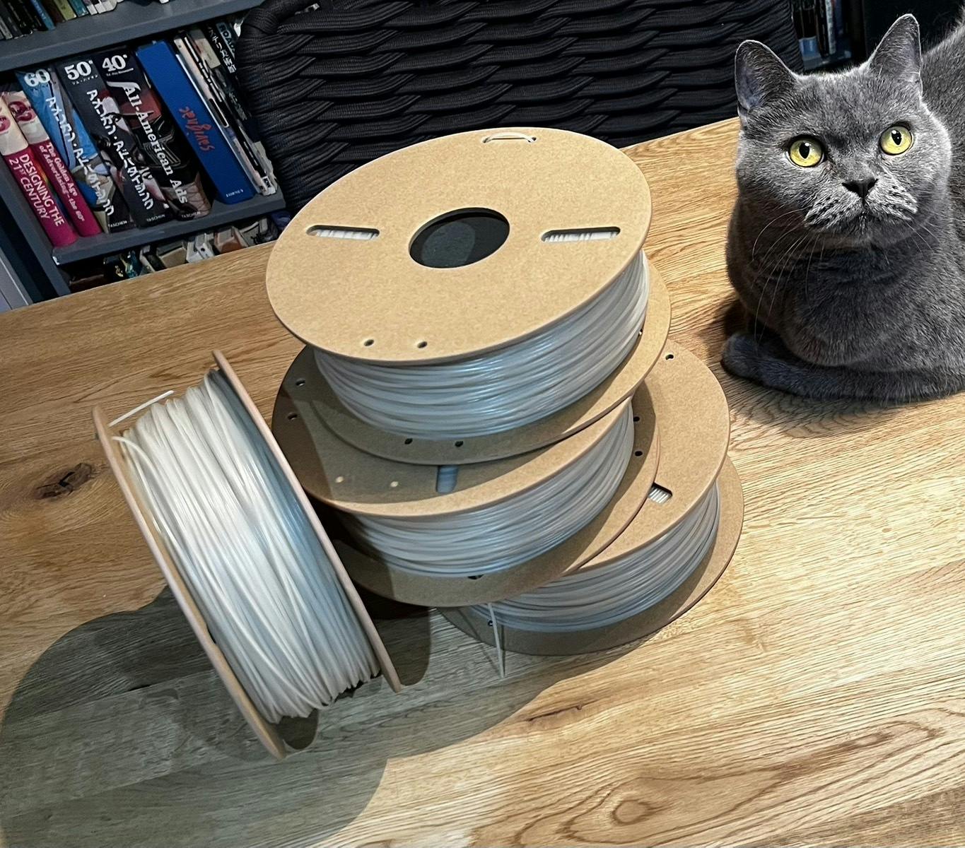 2025/01/11 00:13ご無沙汰しております。岩田一平です。やっと対馬の海ゴミペレットから100%のフィラメントを成型することができました!あれから実際に射出成型を行ってる企業さんや、ペレット式3Dプリンターを扱ってるところにも足を運んで、お話を伺わせていただきました。・金型による射出成型について溶かして固める方法なので、今回のPE(ポリエチレン)素材でも問題なくできるとのことだったのですが、金型を作るには費用がかなり高くなってしまい、最低でも100万円近くかかってしまうとのことで、予算的に断念しました。アルミ簡易金型やシリコン型による真空注型という方法が低コストということでお話を伺いましたが、アルミ金型も60万円以上はかかり、シリコン型は熱で固まる熱可塑性樹脂を使うためPE素材は使えないとのことでした。・ペレット式3Dプリンター実際にペレットを直接入れて印刷することは可能とのことでしたが、家庭用などの小型のものを造形するためにはできておらず、基本的には工業用のかなり大きな造形物を印刷するためのプリンターであるとのことでした。これらのお話から、対馬の再生PE素材で作るという目的と予算を鑑みて、やはりフィラメントでなんとかできないかと色々アプローチをとりました。PE素材によるフィラメント造形は一般的には適していないので、初めての試作になるためコストが高くなってしまうなど、中々予算内で引き受けてくださる企業さんが見つからず苦戦していたのですが、今回何とか株式会社リステムネットワークさんという企業の方が、PE素材での挑戦的なフィラメント造形を引き受けてくださいました。もともとはPEの造形が不安定だったら、他の素材を混ぜて成型するとのことでしたが、対馬の海ゴミ素材100%でのフィラメントを作ることができました!実際にこのフィラメントを印刷ができるかどうか試してみようと思います。 もっと見る