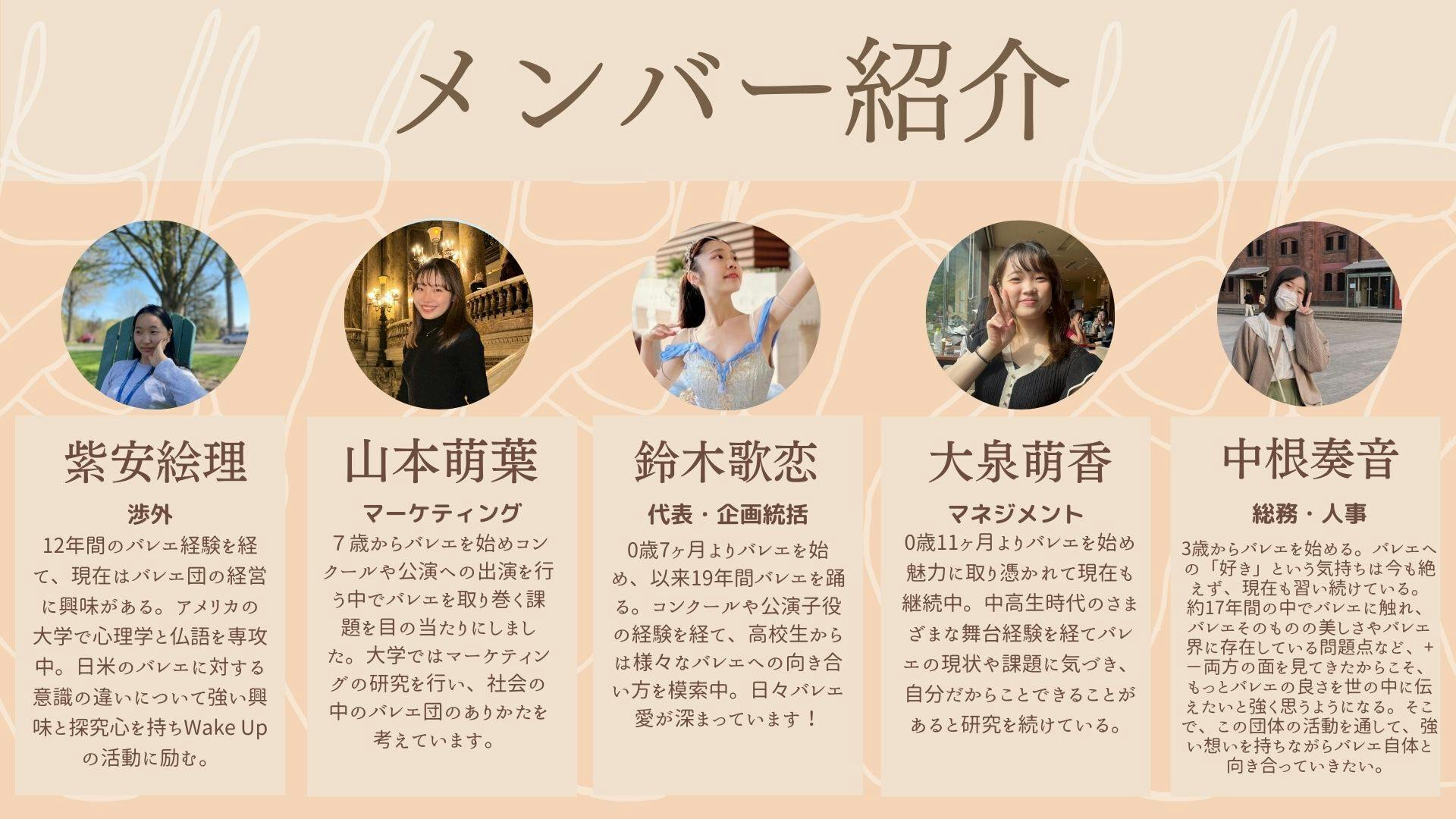 という想いを原動力に、自分達の将来の生き方とバレエを結びつけようとする学生5人が集まりました。バレエは、ダンサーだけでなく、習う人や観客など、より多様で幅広い人々の人生に輝きと美しさを与え、心を豊かにする力を持っています。「踊る」で終わらないバレエの価値を言語化し、自身の生き方に輝きを与えられる居場所作りに挑戦します。