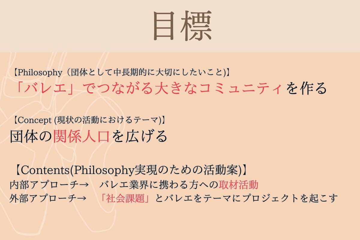 私たちは、「バレエを愛する大学生が社会とバレエの繋げ方を模索する団体」です。