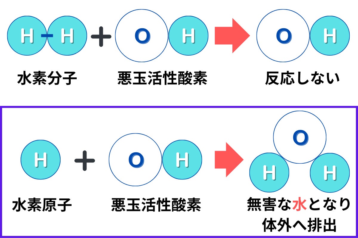 この分子の状態なのか、原子の状態なのか、という点が体内における水素の活躍度合いを決定づけます。