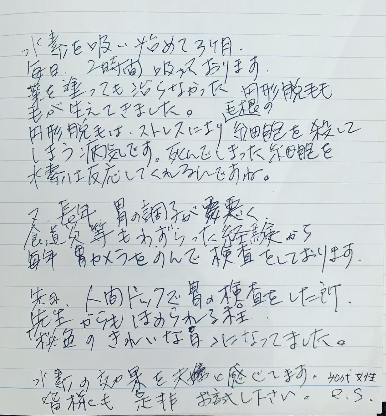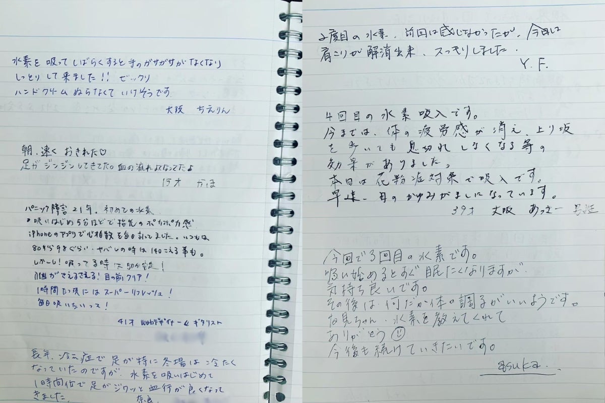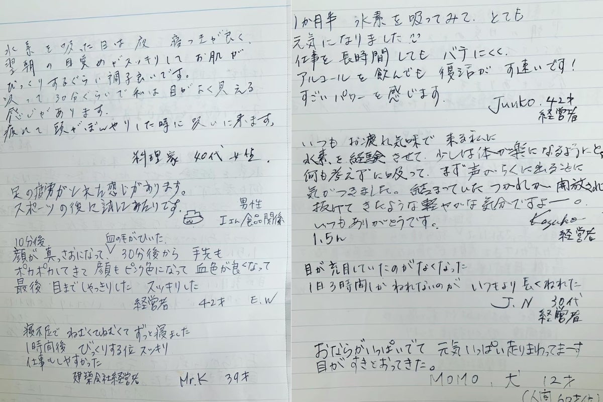 こちらは私のサロンにおいて、HHOガスの吸引を実際に体験された方々の声です。ほんの一部のご紹介になりますが、ご参考ください。