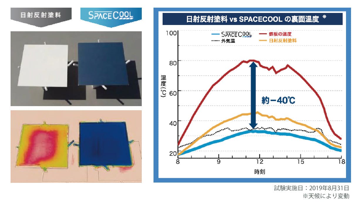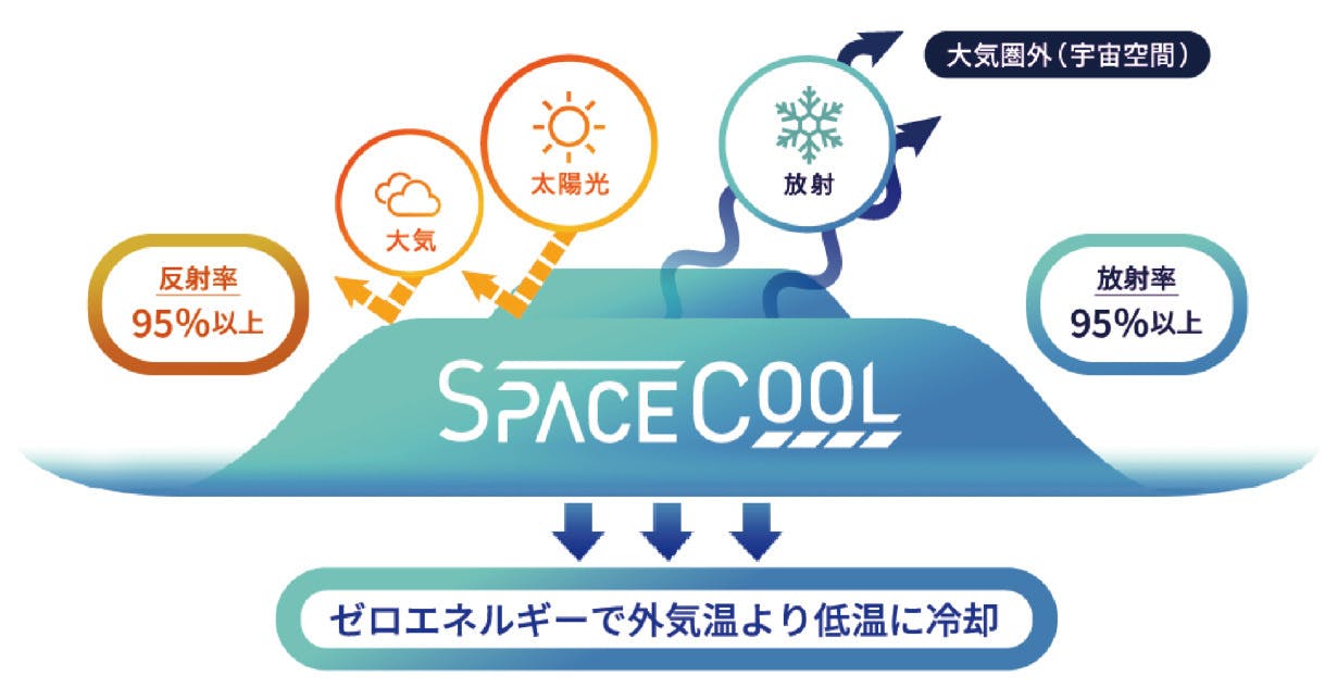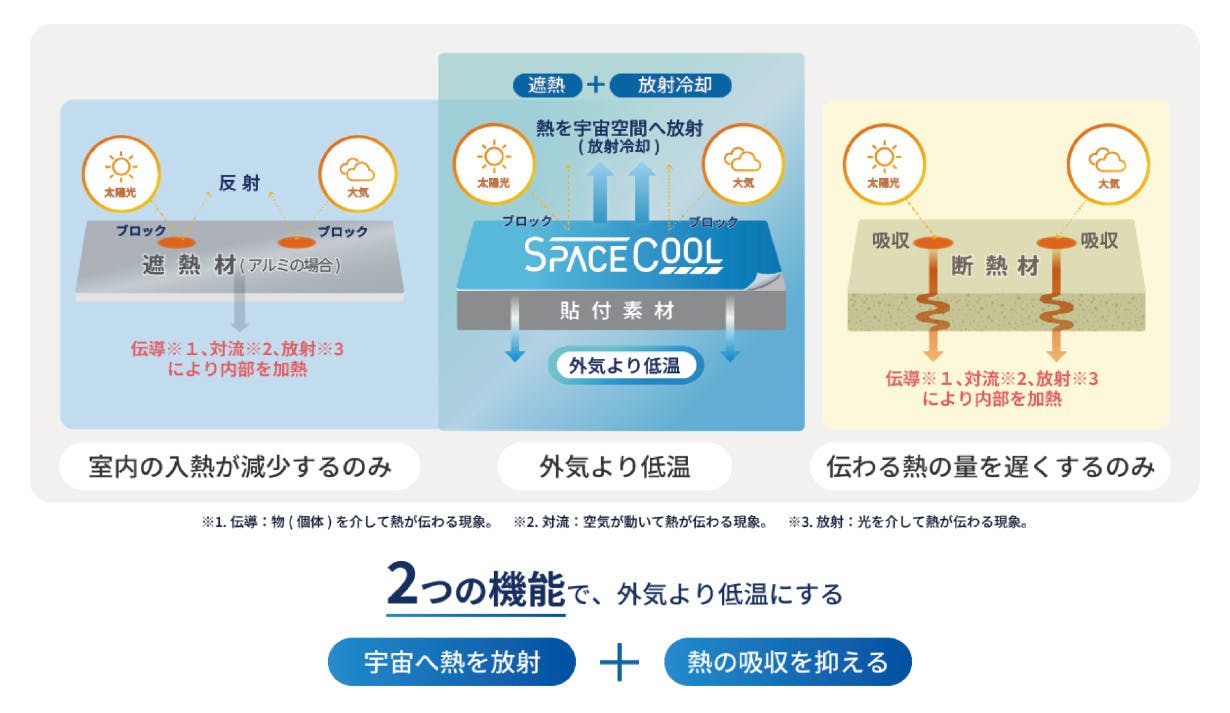 入熱の抑制、熱の伝道を遅くする従来の技術とは異なり、太陽光と大気からの熱をブロックし熱吸収を抑えるだけではなく、宇宙空間へ熱を放射することで熱を捨て、ゼロエネルギーで外気より低温にする新素材です。