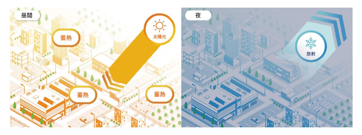 太陽光と大気からの熱をブロックし熱吸収を抑えるだけでなく、宇宙に放射を行うことで熱を捨て、ゼロエネルギーで外気より低温にする新素材です。