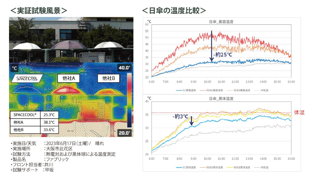 SPACECOOL®日傘の膜温度と黒体温度を他社日傘と比較。