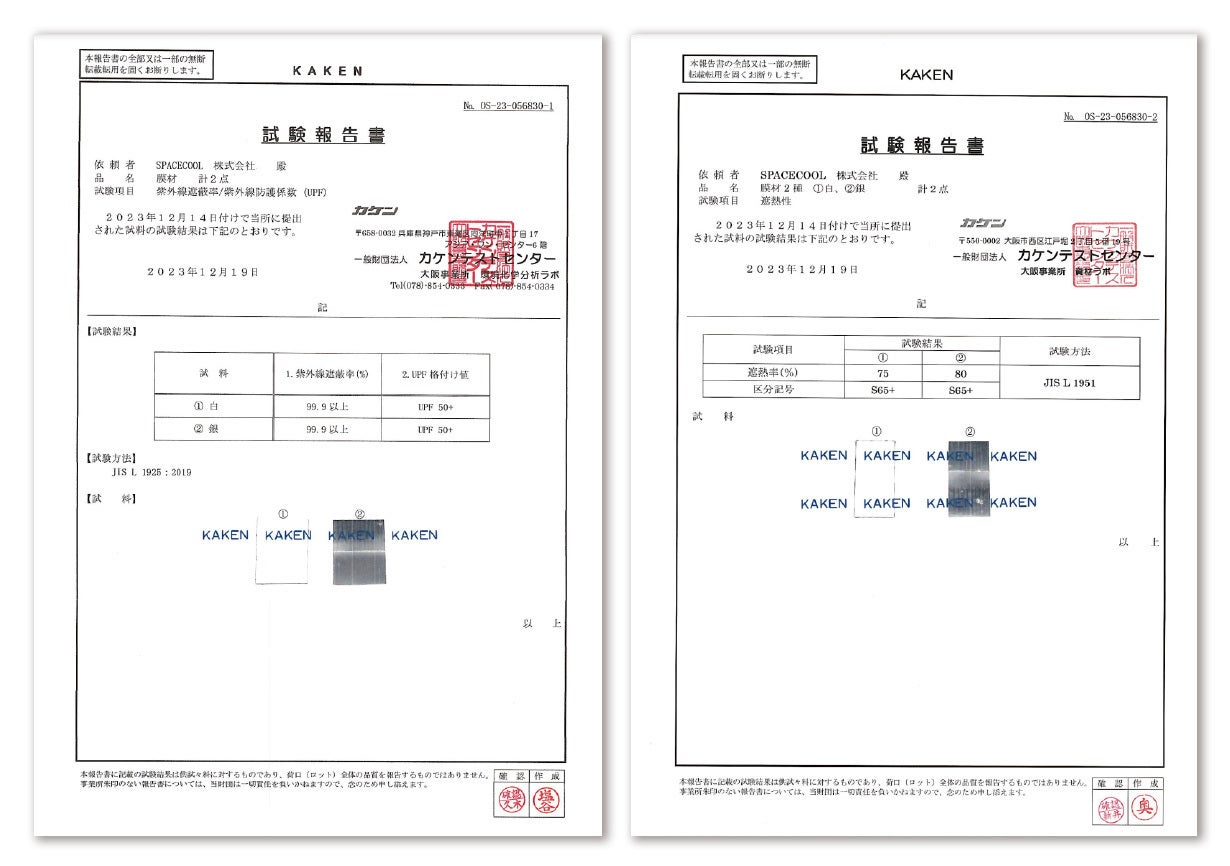 一般財団法人カケンテストセンターにて紫外線遮蔽性試験(JIS L 1925)および遮熱性試験(JIS L 1951)を実施し、ともに最高水準の格付けを獲得しています。