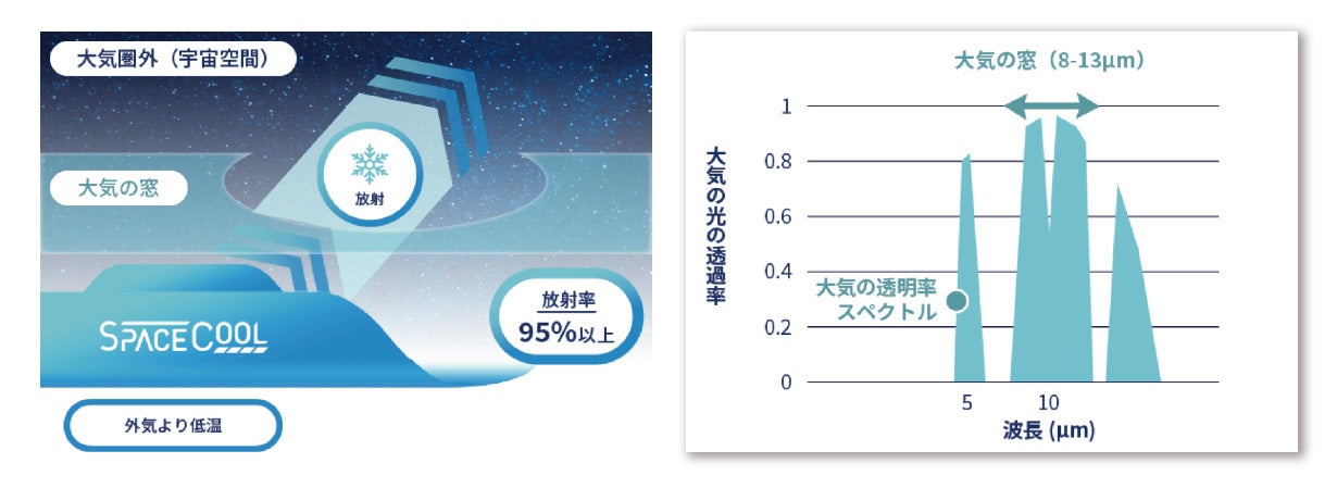 SPACECOOL®は、周辺の熱エネルギーを「大気の窓」の波長域の光エネルギーに変換し、放射冷却機能効果を増大しています。