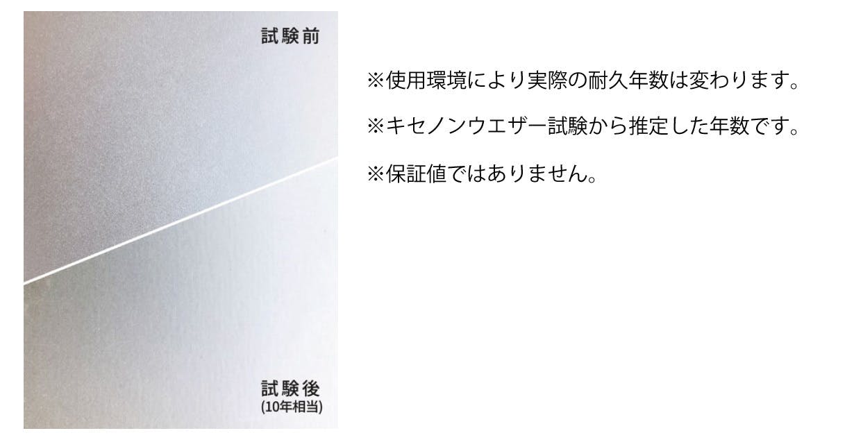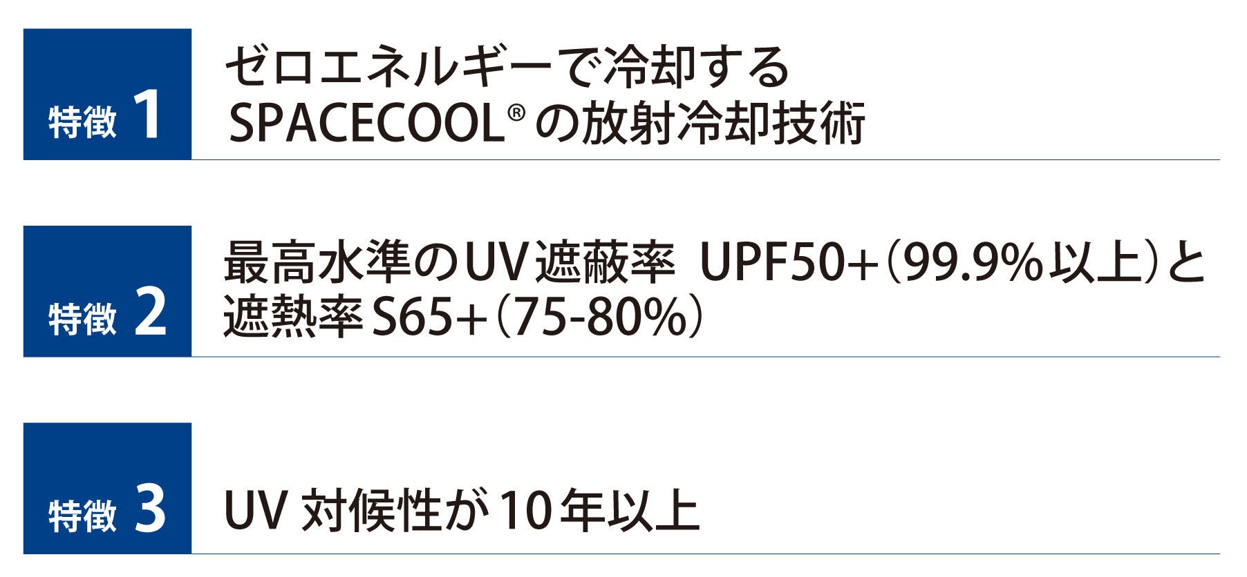 一般的な日傘は傘生地にUVカットコーティングを施しており、寿命はおよそ2~3年と言われております。一方、SPACECOOL®の紫外線対する耐候性能は10年以上*で、より長くお使いいただくことができます。