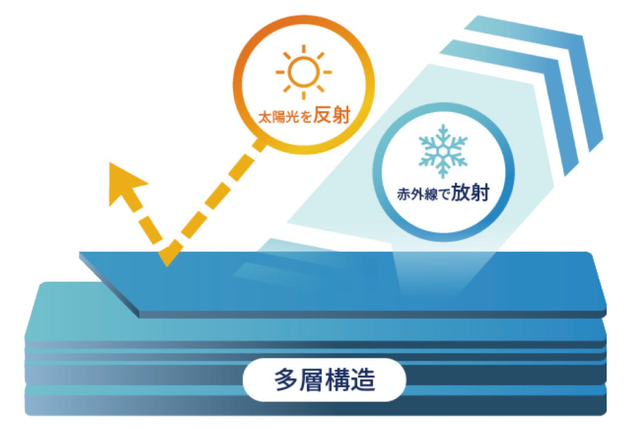 独自の多層構造によって、太陽光をブロックし熱吸収を抑える遮熱機能(反射率95%以上)と、「大気の窓」の波長域の波長域の赤外線を増大し、宇宙に放射を行うことで熱を捨てる放射冷却機能(放射率95%以上)を、両立しました。