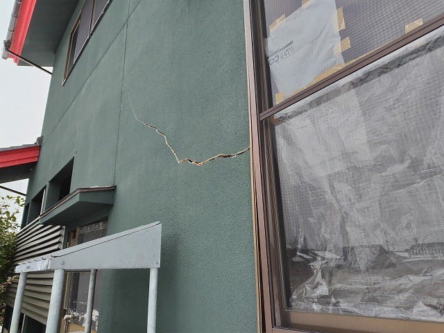 建物全体にわたり、多数のクラックが発生し、外壁には破損が見られます。特に、液状化現象の影響により写真ではわかりませんが建物が傾いております。