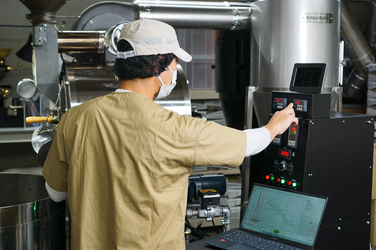 使用する焙煎機はFUJ ROYAL R-110。20年以上も前に製造された年季の入ったこの機械にデジタル制御など独自の改良を施し、データロガーによる焙煎工程の管理も行い、機能性と操作性と再現性を向上させています。