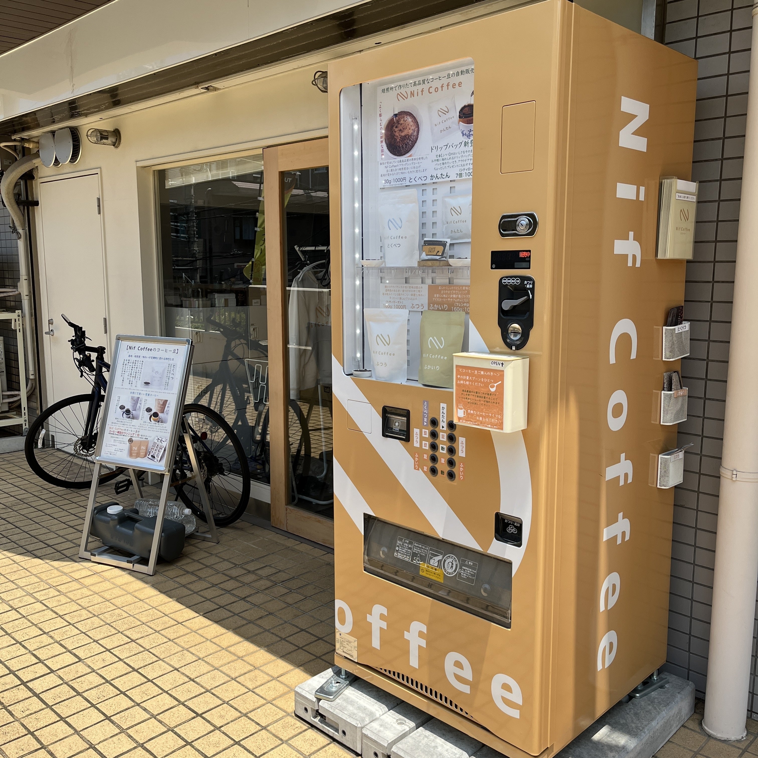 「焙煎所前にコーヒー豆の自動販売機があり、24時間いつでも新鮮な豆をお買い求めいただけます。」