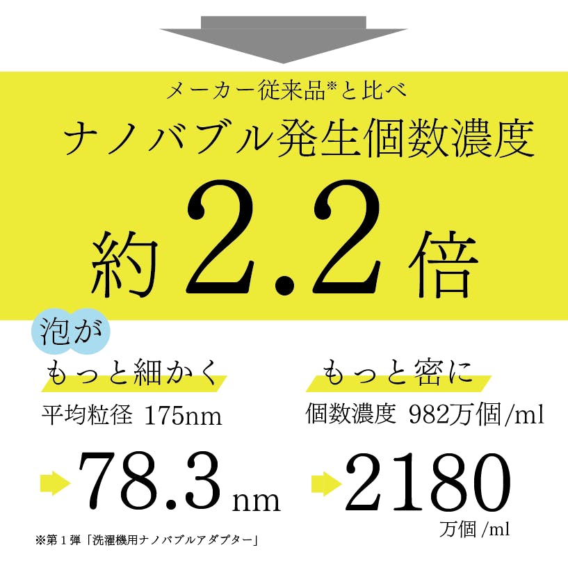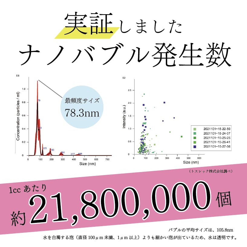 この構造により発生するナノバブルの数は1ccあたり約21,800,000個という天文学的な数字。